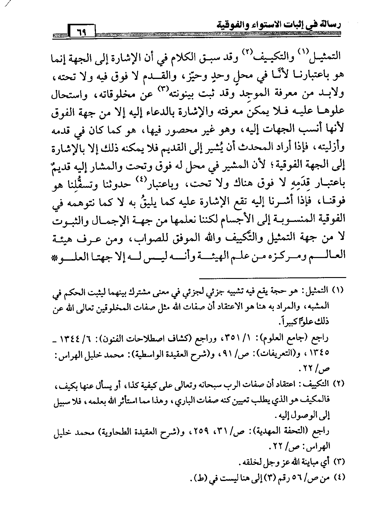 التَّمْثِيل والتكييف وَقد سبق الْكَلَام فِي أَن الْإِشَارَة إِلَى الْجِهَة إِنَّمَا هُوَ باعتبارنا لأَنا فِي مَحل وحد وحيز والقدم لَا فَوق فِيهِ وَلَا تَحْتَهُ وَلَا بُد من معرفَة الموجد وَقد ثَبت بينونته عَن مخلوقاته واستحال علوها عَلَيْهِ فَلَا يُمكن مَعْرفَته وَالْإِشَارَة بِالدُّعَاءِ إِلَيْهِ إِلَّا من جِهَة الفوق لِأَنَّهَا أنسب الْجِهَات إِلَيْهِ وَهُوَ غير مَحْصُور فِيهَا هُوَ كَمَا كَانَ فِي قدمه وأزليته فَإِذا أَرَادَ الْمُحدث أَن يُشِير إِلَى الْقَدِيم فَلَا يُمكنهُ ذَلِك إِلَّا بِالْإِشَارَةِ إِلَى الْجِهَة الْفَوْقِيَّة لِأَن المشير فِي مَحل لَهُ فَوق وَتَحْت والمشار إِلَيْهِ قديم بِاعْتِبَار قدمه لَا فَوق هُنَاكَ وَلَا تَحت وَبِاعْتِبَار حدوثنا وتسفلنا هُوَ فَوْقنَا فَإِذا أَشَرنَا إِلَيْهِ تقع الْإِشَارَة عَلَيْهِ كَمَا يَلِيق بِهِ لَا كَمَا نتوهمه فِي الْفَوْقِيَّة المنسوبة إِلَى الْأَجْسَام لكننا نعلمها من جِهَة الْإِجْمَال والثبوت لَا من جِهَة التَّمْثِيل والتكييف وَالله الْمُوفق للصَّوَاب وَمن عرف هَيْئَة الْعَالم ومركزه من علم الْهَيْئَة وَأَنه لَيْسَ لَهُ إِلَّا جهتا الْعُلُوّ