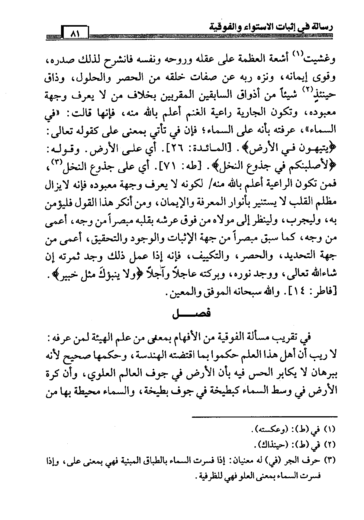 فِي تقريب مَسْأَلَة الْفَوْقِيَّة من الأفهام بِمَعْنى من علم الْهَيْئَة لمن عرفه لَا ريب أَن أهل هَذَا الْعلم حكمُوا بِمَا اقتضته الهندسة وَحكمهَا صَحِيح لِأَنَّهُ ببرهان لَا يكابر الْحس فِيهِ بِأَن الأَرْض فِي جَوف الْعَالم الْعلوِي وَأَن كرة الأَرْض فِي وسط السَّمَاء كبطيخة فِي جَوف بطيخة وَالسَّمَاء مُحِيطَة بهَا من
