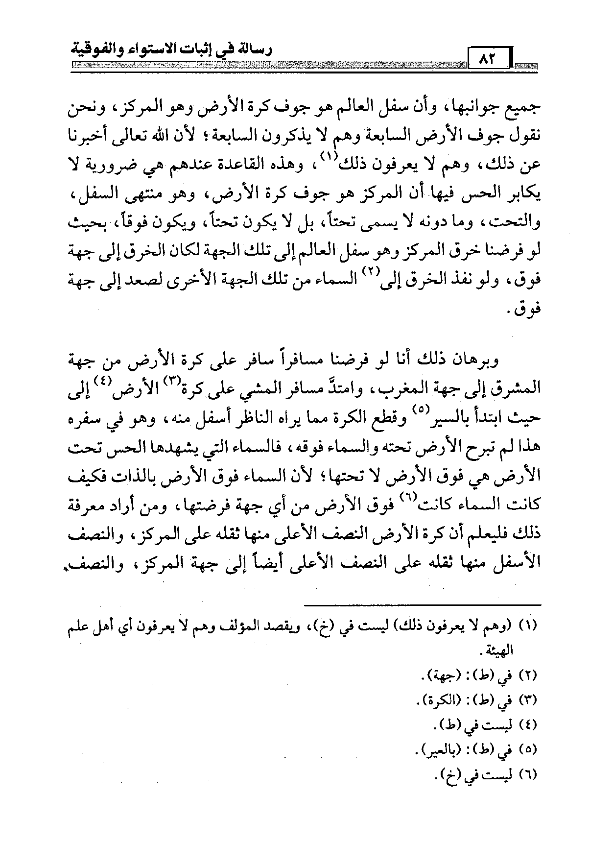 جَمِيع جوانبها وَأَن سقل الْعَالم هُوَ جَوف كرة الأَرْض وَهُوَ المركز وَنحن نقُول جَوف الأَرْض السَّابِعَة وهم لَا يذكرُونَ السَّابِعَة لِأَن الله تَعَالَى أخبرنَا عَن ذَلِك وهم لَا يعْرفُونَ ذَلِك وَهَذِه الْقَاعِدَة عِنْدهم هِيَ ضَرُورِيَّة لَا يكابر الْحس فِيهَا أَن المركز هُوَ جَوف كرة الأَرْض وَهُوَ مُنْتَهى السّفل والتحت وَمَا دونه لَا يُسمى تحتا بل لَا يكون تحتا وَيكون فوقا بِحَيْثُ لَو فَرضنَا خرق المركز وَهُوَ سفل الْعَالم إِلَى تِلْكَ الْجِهَة لَكَانَ الْخرق إِلَى جِهَة فَوق وَلَو نفذ الْخرق إِلَى السَّمَاء من تِلْكَ الْجِهَة الْأُخْرَى لصعد إِلَى جِهَة فَوق
