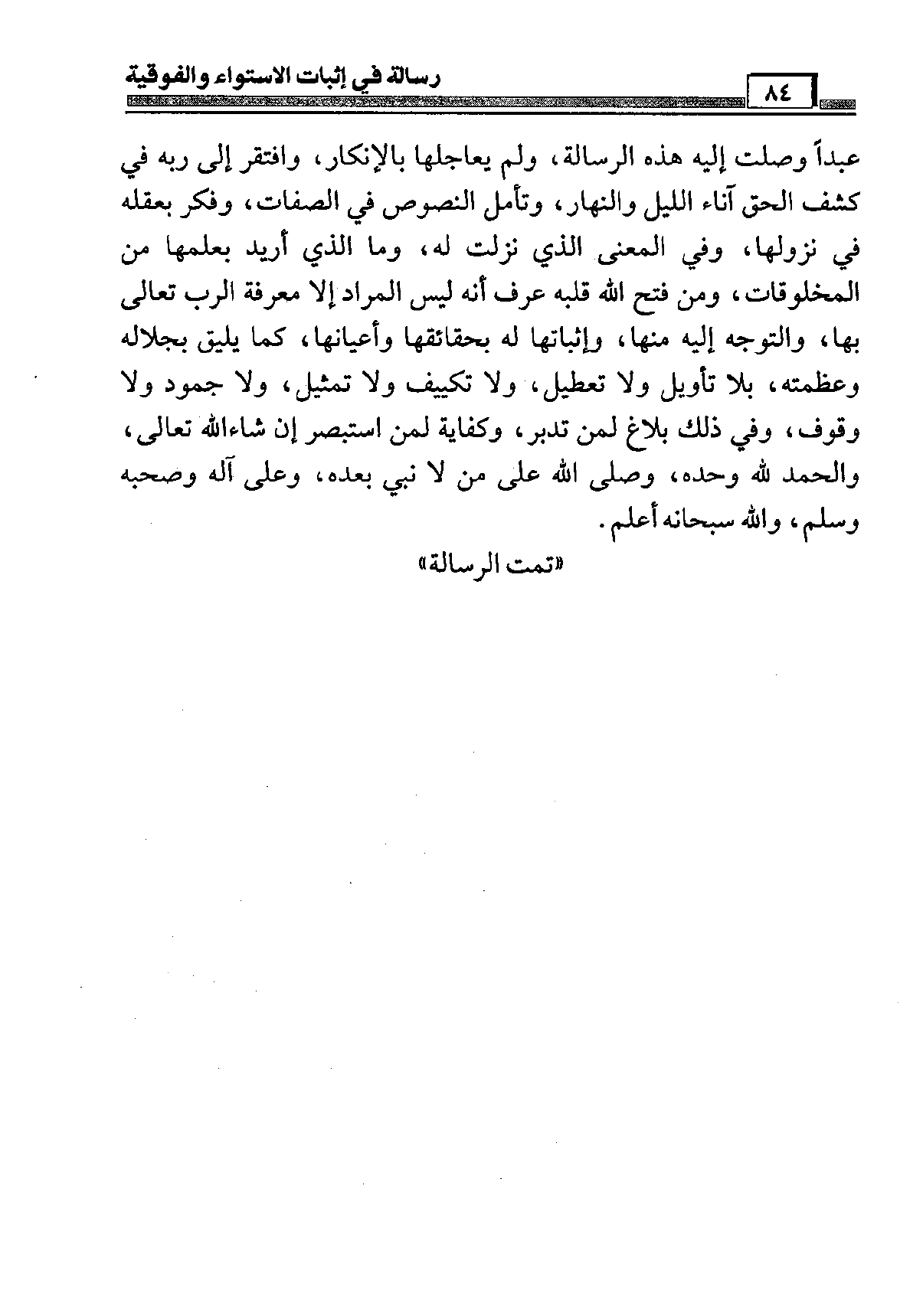 عبدا وصلت إِلَيْهِ هَذِه الرسَالَة وَلم يعاجها بالإنكار وافتقر إِلَى ربه فِي كشف الْحق آنَاء اللَّيْل وَالنَّهَار وَتَأمل النُّصُوص فِي الصِّفَات وفكر بعقله فِي نُزُولهَا وَفِي الْمَعْنى الَّذِي نزلت لَهُ وَمَا الَّذِي أُرِيد بعلمها من الْمَخْلُوقَات وَمن فتح الله قلبه عرف أَنه لَيْسَ المُرَاد إِلَّا معرفَة الرب تَعَالَى بهَا والتوجه إِلَيْهِ مِنْهَا وإثباتها لَهُ بحقائقها وأعيانها كَمَا يَلِيق بجلاله وعظمته بِلَا تَأْوِيل وَلَا تَعْطِيل وَلَا تكييف وَلَا تَمْثِيل وَلَا جمود وَلَا وقُوف وَفِي ذَلِك بَلَاغ لمن تدبر وكفاية لمن استبصر إِن شَاءَ الله تَعَالَى وَالْحَمْد لله وَحده وَصلى الله على من لَا نَبِي بعده وعَلى آله وَصَحبه وَسلم وَالله سُبْحَانَهُ أعلم