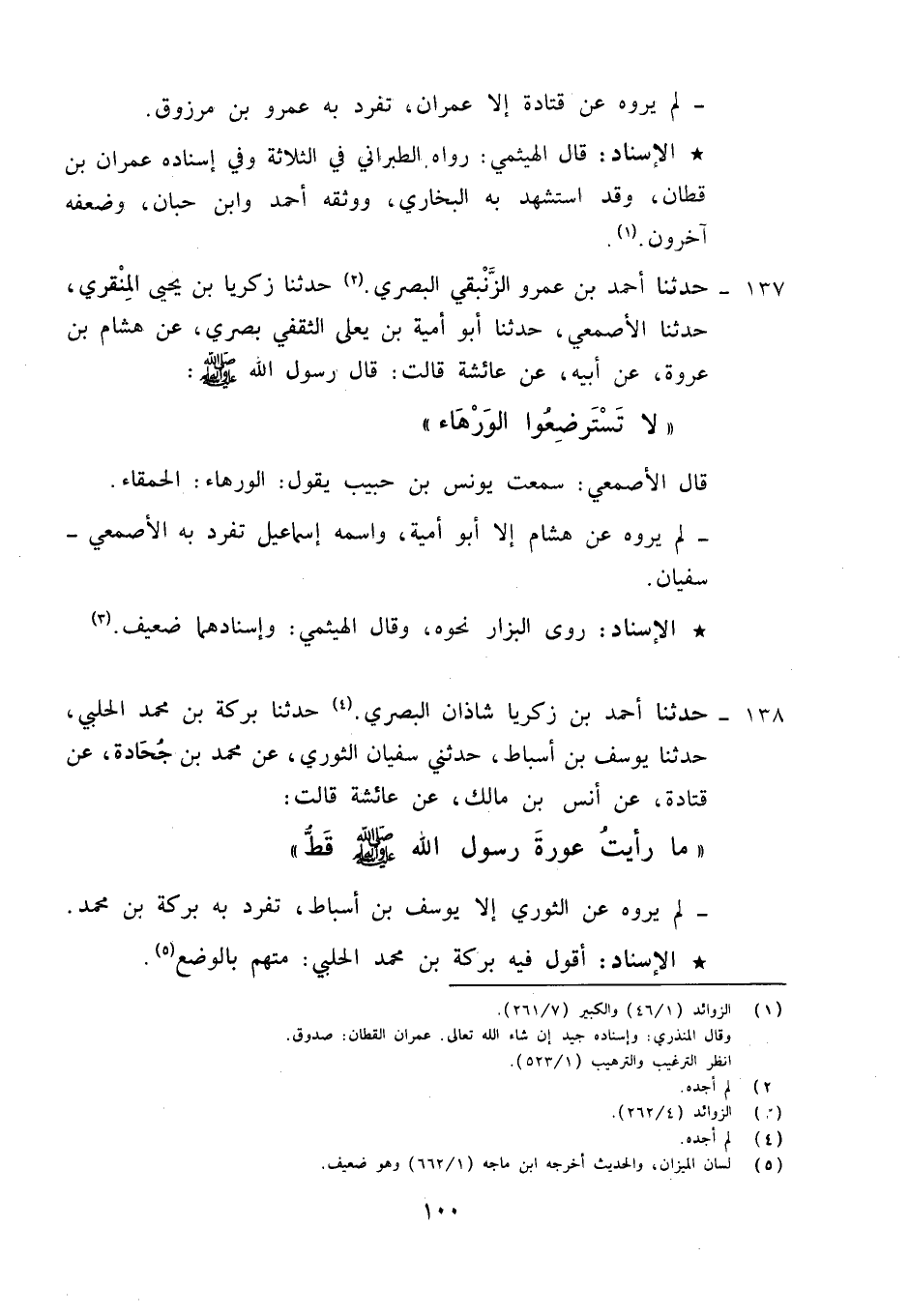 137 - حَدَّثَنَا أَحْمَدُ بْنُ عَمْرٍو الزُّنْبُقِيُّ الْبَصْرِيُّ، حَدَّثَنَا زَكَرِيَّا بْنُ يَحْيَى الْمِنْقَرِيُّ، حَدَّثَنَا الْأَصْمَعِيُّ، حَدَّثَنَا أَبُو أُمَيَّةَ بْنُ يَعْلَى الثَّقَفِيُّ بَصْرِيُّ عَنْ هِشَامِ بْنِ عُرْوَةَ، عَنْ أَبِيهِ، عَنْ عَائِشَةَ قَالَتْ: قَالَ رَسُولُ اللَّهِ صَلَّى اللهُ عَلَيْهِ وَسَلَّمَ: «§لَا تَسْتَرْضِعُوا الْوَرْهَاءَ» ، قَالَ الْأَصْمَعِيُّ: سَمِعْتُ يُونُسَ بْنَ حَبِيبٍ يَقُولُ: الْوَرْهَاءُ: الْحَمْقَاءُ، لَمْ يَرْوِهِ عَنْ هِشَامٍ إِلَّا أَبُو أُمَيَّةَ وَاسْمُهُ إِسْمَاعِيلُ تَفَرَّدَ بِهِ الْأَصْمَعِيُّ سُفْيَانُ