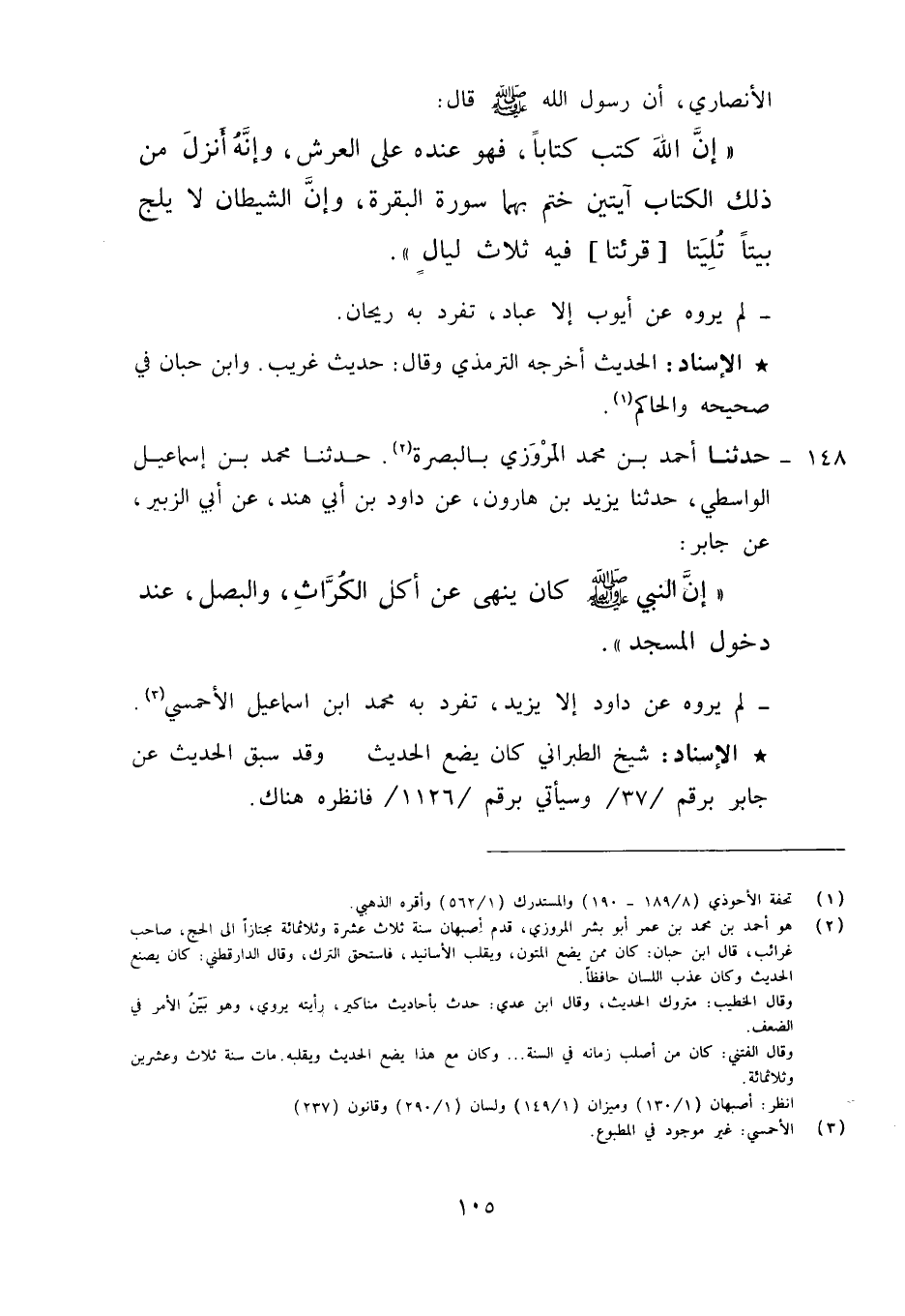 148 - حَدَّثَنَا أَحْمَدُ بْنُ مُحَمَّدٍ الْمَرْوَزِيُّ بِالْبَصْرَةَ , حَدَّثَنَا مُحَمَّدُ بْنُ إِسْمَاعِيلَ الْوَاسِطِيُّ، حَدَّثَنَا يَزِيدُ بْنُ هَارُونَ، عَنْ دَاوُدَ بْنِ أَبِي هِنْدَ، عَنْ أَبِي الزُّبَيْرِ، عَنْ جَابِرٍ أَنَّ النَّبِيَّ صَلَّى اللَّهُ عَلَيْهِ وَآلِهِ وَسَلَّمَ: «§كَانَ يَنْهَى عَنْ أَكْلِ الْكُرَّاثِ وَالْبَصَلِ عِنْدَ دُخُولِ الْمَسْجِدَ» لَمْ يَرْوِهِ عَنْ دَاوُدَ إِلَّا يَزِيدُ تَفَرَّدَ بِهِ مُحَمَّدُ بْنُ إِسْمَاعِيلَ