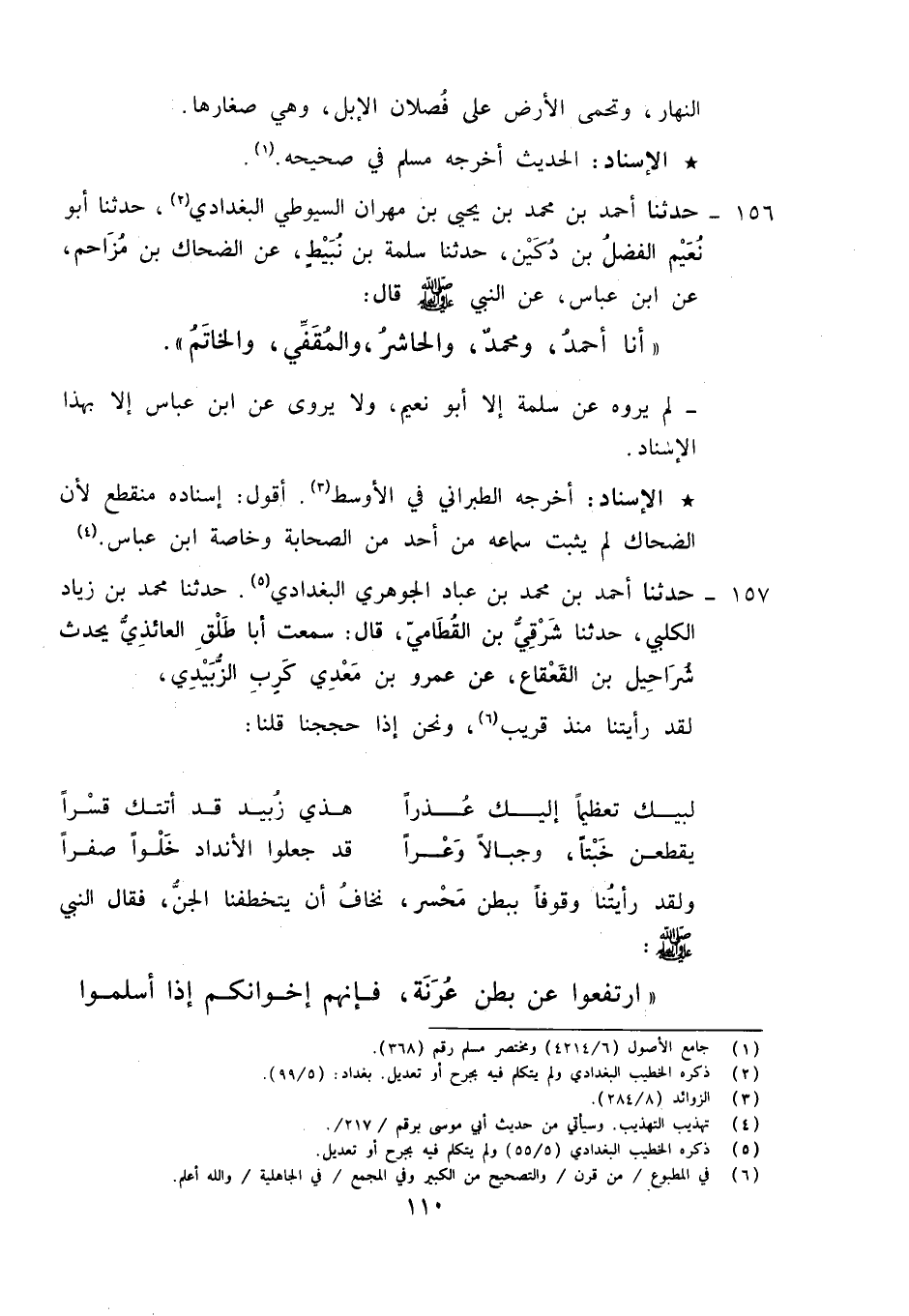 وَلَقَدْ رَأَيْتُنَا وُقُوفًا بِبَطْنِ مُحَسِّرٍ نَخَافُ أَنْ يَتَخَطَّفَنَا الْجِنَّ , فَقَالَ النَّبِيُّ صَلَّى اللهُ عَلَيْهِ وَسَلَّمَ: «§ارْتَفِعُوا عَنْ بَطْنِ عُرَنَةَ؛ فَإِنَّهُمْ إِخْوَانُكُمْ إِذَا أَسْلَمُوا» , وَعَلَّمَنَا التَّلْبِيَةَ: لَبَّيْكَ اللَّهُمَّ لَبَّيْكَ , لَبَّيْكَ لَا شَرِيكَ لَكَ لَبَّيْكَ , إِنَّ الْحَمْدَ وَالنِّعْمَةَ لَكَ وَالْمُلْكَ , لَا شَرِيكَ لَكَ"، لَمْ يَرْوِهِ عَنْ شَرَفِيٍّ إِلَّا مُحَمَّدُ بْنُ زِيَادٍ