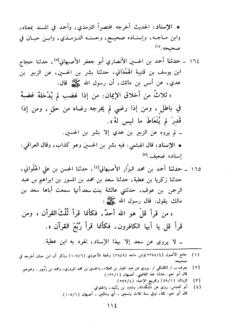 164 - حَدَّثَنَا أَحْمَدُ بْنُ الْحُسَيْنِ الْأَنْصَارِيُّ أَبُو جَعْفَرٍ الْأَصْبَهَانِيُّ، حَدَّثَنَا حَجَّاجُ بْنُ يُوسُفَ بْنِ قُتَيْبَةَ الْهَمْدَانِيُّ، حَدَّثَنَا بِشْرُ بْنُ الْحُسَيْنِ، عَنِ الزُّبَيْرِ بْنِ عَدِيٍّ، عَنْ أَنَسِ بْنِ مَالِكٍ: أَنَّ رَسُولَ اللَّهِ صَلَّى اللَّهُ عَلَيْهِ وَآلِهِ وَسَلَّمَ قَالَ: " §ثَلَاثٌ مِنْ أَخْلَاقِ الْإِيمَانِ: مَنْ إِذَا غَضِبَ لَمْ يُدْخِلْهُ غَضَبُهُ فِي بَاطِلٍ , وَمَنْ إِذَا رَضِيَ لَمْ يُخْرِجْهُ رِضَاهُ مِنْ حَقٍّ , وَمَنْ إِذَا قَدَرَ لَمْ يَتَعَاطَ مَا لَيْسَ لَهُ " لَمْ يَرْوِهِ عَنِ الزُّبَيْرِ بْنِ عَدِيٍّ إِلَّا بِشْرُ بْنُ الْحُسَيْنِ