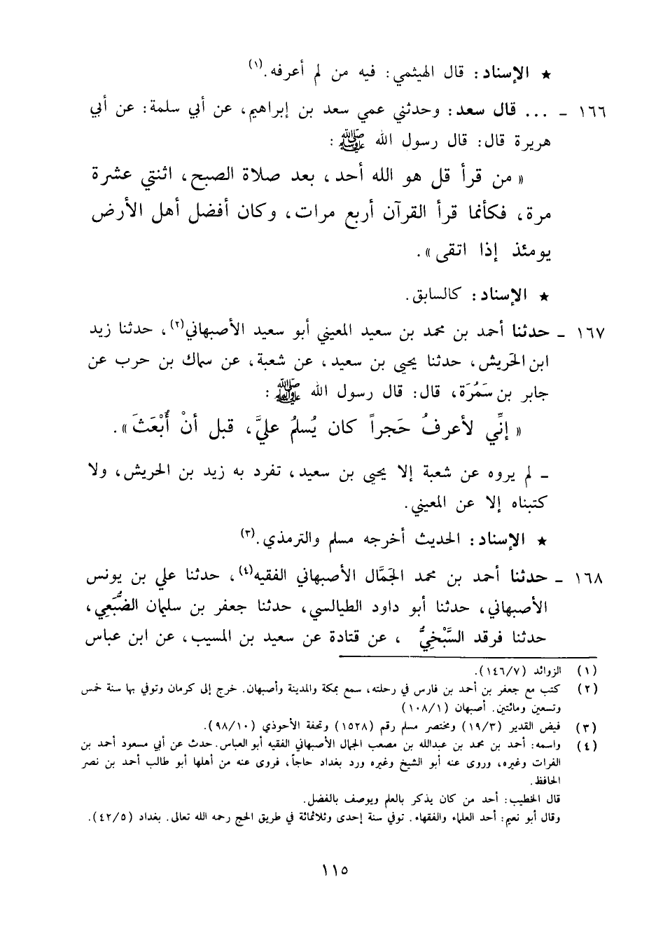 166 - قَالَ سَعْدٌ: وَحَدَّثَنِي عَمِّي سَعْدُ بْنُ إِبْرَاهِيمَ , عَنْ أَبِي سَلَمَةَ، عَنْ أَبِي هُرَيْرَةَ قَالَ: قَالَ رَسُولُ اللَّهِ صَلَّى اللَّهُ عَلَيْهِ وَآلِهِ وَسَلَّمَ: " §مَنْ قَرَأَ: قُلْ هُوَ اللَّهُ أَحَدٌ بَعْدَ صَلَاةِ الصُّبْحِ اثْنَتَيْ عَشْرَةَ مَرَّةً فَكَأَنَّمَا قَرَأَ الْقُرْآنَ أَرْبَعَ مَرَّاتٍ , وَكَانَ أَفْضَلَ أَهْلِ الْأَرْضِ يَوْمَئِذٍ إِذَا اتَّقَى "، لَا يُرْوَى عَنْ سَعْدٍ إِلَّا بِهَذَا الْإِسْنَادِ تَفَرَّدَ بِهِ ابْنُ عَطِيَّةَ، وَلَا يُرْوَى حَدِيثُ سَعْدِ بْنِ إِبْرَاهِيمَ عَنْ أَبِي سَلَمَةَ عَنْ أَبِي هُرَيْرَةَ إِلَّا بِهَذَا الْإِسْنَادِ. تَفَرَّدَ بِهِ ابْنُ عَطِيَّةَ أَيْضًا