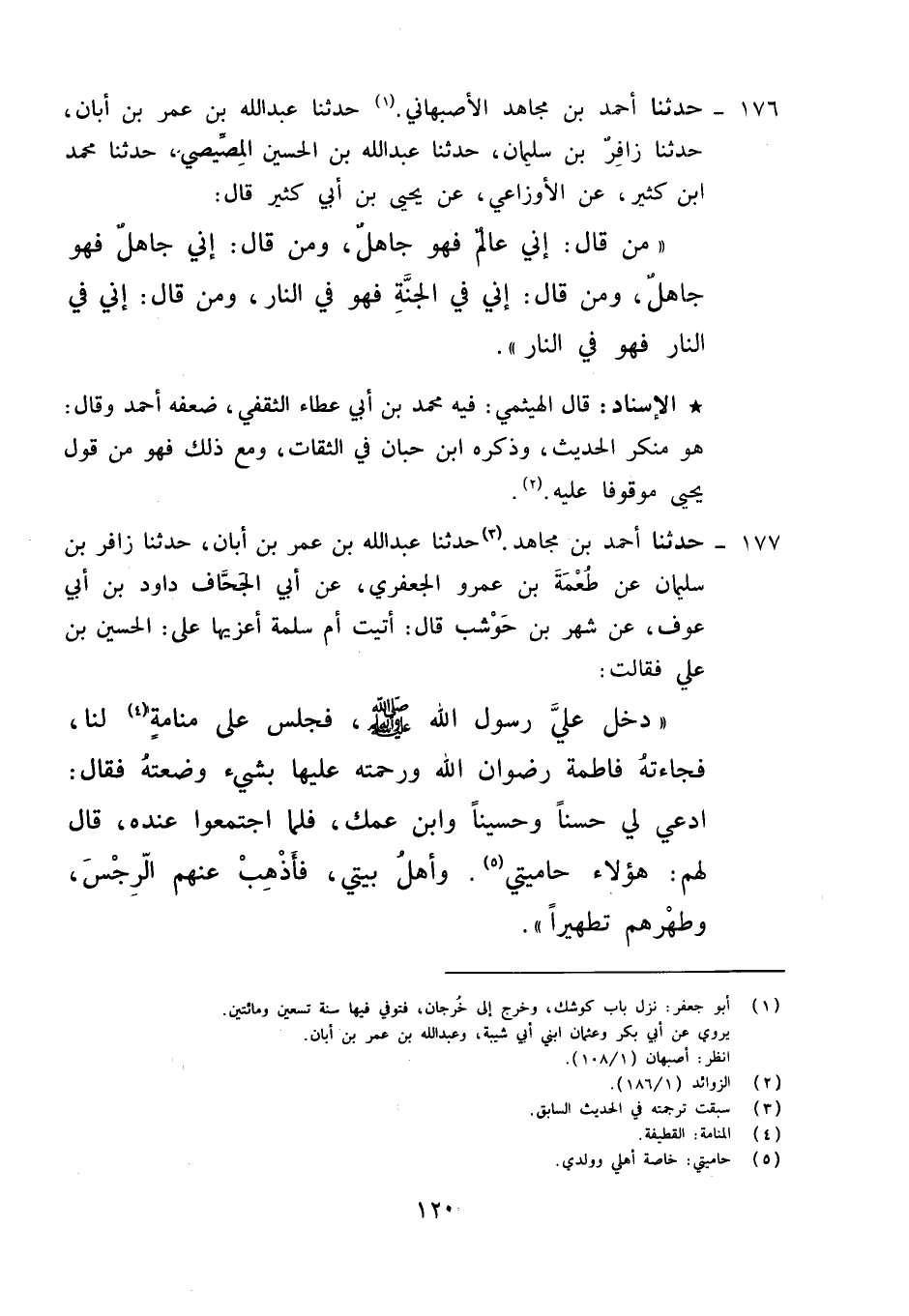 177 - حَدَّثَنَا أَحْمَدُ بْنُ مُجَاهِدٍ الْأَصْبَهَانِيُّ، حَدَّثَنَا عَبْدُ اللَّهِ بْنُ عُمَرَ بْنِ أَبَانَ، حَدَّثَنَا زَافِرُ بْنُ سُلَيْمَانَ، عَنْ طُعْمَةَ بْنِ عَمْرٍو الْجَعْفَرِيِّ، عَنْ أَبِي الْجَحَّافِ دَاوُدَ بْنِ أَبِي عَوْفٍ , عَنْ شَهْرِ بْنِ حَوْشَبٍ قَالَ: أَتَيْتُ أُمَّ سَلَمَةَ أُعَزِّيهَا عَلَى الْحُسَيْنِ بْنِ عَلِيٍّ فَقَالَتْ: دَخَلَ عَلَيَّ رَسُولُ اللَّهِ صَلَّى اللهُ عَلَيْهِ وَسَلَّمَ فَجَلَسَ عَلَى مَنَامَةٍ لَنَا , فَجَاءَتْهُ فَاطِمَةُ رِضْوَانُ اللَّهِ وَرَحْمَتُهُ عَلَيْهَا بِشَيْءٍ وَضَعْتُهُ , فَقَالَ: «ادْعِي لِي حَسَنًا وَحُسَيْنًا وَابْنَ عَمِّكِ عَلِيًّا» , فَلَمَّا اجْتَمَعُوا عِنْدَهُ قَالَ لَهُمْ: «§هَؤُلَاءِ حَامَتِي وَأَهْلُ بَيْتِي , فَأَذْهِبْ عَنْهُمُ الرِّجْسَ وَطَهِّرْهُمْ تَطْهِيرًا» لَمْ يَرْوِهِ عَنْ طُعْمَةَ إِلَّا زَافِرٌ، تَفَرَّدَ بِهِ عَبْدُ اللَّهِ بْنُ عُمَرَ مِشْكِدَانَةُ