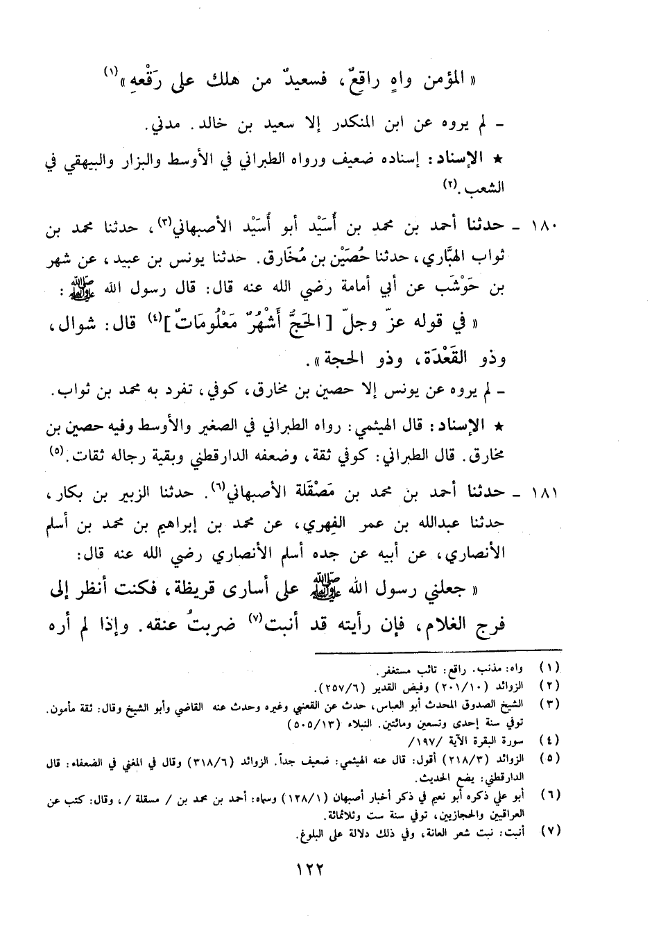 181 - حَدَّثَنَا أَحْمَدُ بْنُ مُحَمَّدِ بْنِ مَصْقَلَةَ الْأَصْبَهَانِيُّ، حَدَّثَنَا الزُّبَيْرُ بْنُ بَكَّارٍ، حَدَّثَنَا عَبْدُ اللَّهِ بْنُ عَمْرٍو الْفِهْرِيُّ، عَنْ مُحَمَّدِ بْنِ إِبْرَاهِيمَ بْنِ مُحَمَّدِ بْنِ أَسْلَمَ الْأَنْصَارِيُّ، عَنْ أَبِيهِ، عَنْ جَدِّهِ أَسْلَمَ الْأَنْصَارِيِّ رَضِيَ اللَّهُ عَنْهُ قَالَ: «§جَعَلَنِي رَسُولُ اللَّهِ صَلَّى اللَّهُ عَلَيْهِ وَآلِهِ وَسَلَّمَ عَلَى أُسَارَى قُرَيْظَةَ , فَكُنْتُ أَنْظُرُ إِلَى فَرْجِ الْغُلَامِ , فَإِنْ رَأَيْتُهُ قَدْ أَنْبَتَ ضَرَبْتُ عُنُقَهُ , وَإِذَا لَمْ أَرَهُ قَدْ أَنْبَتَ جَعَلْتُهُ فِي مَغَانِمِ الْمُسْلِمِينَ» لَا يُرْوَى عَنْ أَسْلَمَ إِلَّا بِهَذَا الْإِسْنَادِ تَفَرَّدَ بِهِ الزُّبَيْرُ بْنُ بَكَّارٍ وَهُوَ أَسْلَمُ بْنُ بَجْرَةَ
