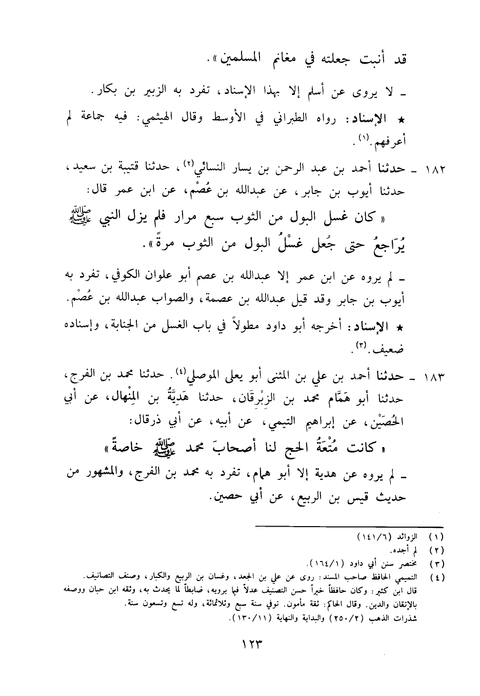 182 - حَدَّثَنَا أَحْمَدُ بْنُ عَبْدِ الرَّحْمَنِ بْنِ يَسَارٍ النَّسَائِيُّ، حَدَّثَنَا قُتَيْبَةُ بْنُ سَعِيدٍ، حَدَّثَنَا أَيُّوبُ بْنُ جَابِرٍ، عَنْ عَبْدِ اللَّهِ بْنِ عُصَمَ، عَنِ ابْنِ عُمَرَ قَالَ: «§كَانَ غُسْلُ الْبَوْلِ مِنَ الثَّوْبِ سَبْعَ مِرَارٍ , فَلَمْ يَزَلِ النَّبِيُّ صَلَّى اللهُ عَلَيْهِ وَسَلَّمَ يُرَاجِعُ حَتَّى جَعَلَ غُسْلَ الْبَوْلِ مِنَ الثَّوْبِ مَرَّةً» لَمْ يَرْوِهِ عَنِ ابْنِ عُمَرَ إِلَّا عَبْدُ اللَّهِ بْنُ عُصَمَ أَبُو عُلْوَانَ الْكُوفِيُّ تَفَرَّدَ بِهِ أَيُّوبُ بْنُ جَابِرٍ , وَقَدْ قِيلَ عَبْدُ اللَّهِ بْنُ عِصْمَةَ , وَالصَّوَابُ عَبْدُ اللَّهِ بْنُ عُصَمَ