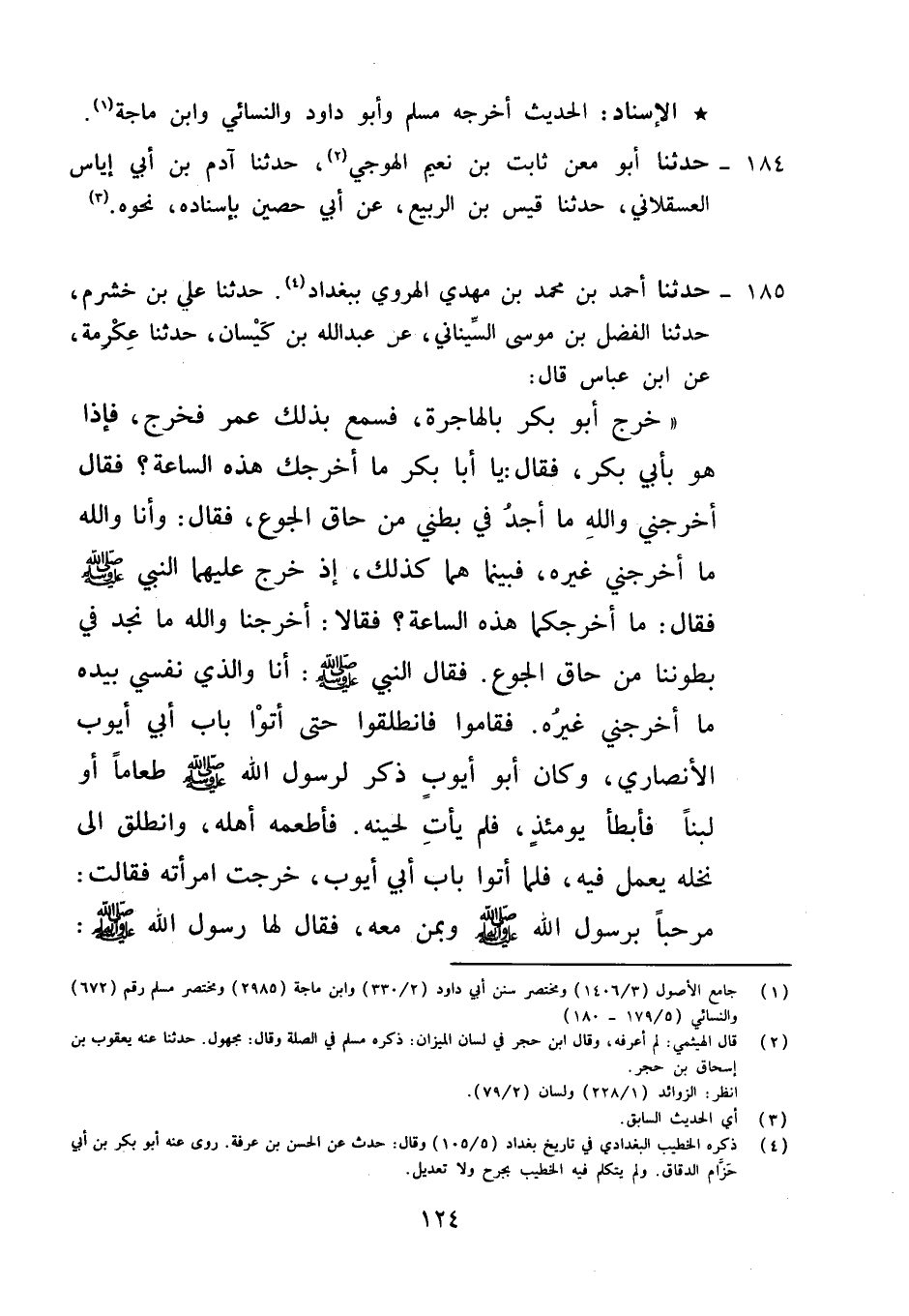 185 - حَدَّثَنَا أَحْمَدُ بْنُ مُحَمَّدِ بْنِ مَهْدِيٍّ الْهَرَوِيُّ بِبَغْدَادَ , حَدَّثَنَا عَلِيُّ بْنُ خَشْرَمٍ، حَدَّثَنَا الْفَضْلُ بْنُ مُوسَى السِّينَانِيُّ، عَنْ عَبْدِ اللَّهِ بْنِ كَيْسَانَ، حَدَّثَنَا عِكْرِمَةُ، عَنِ ابْنِ عَبَّاسٍ قَالَ: خَرَجَ أَبُو بَكْرٍ بِالْهَاجِرَةِ , فَسَمِعَ بِذَلِكَ عُمَرُ فَخَرَجَ , فَإِذَا هُوَ بِأَبِي بَكْرٍ , فَقَالَ: يَا أَبَا بَكْرٍ , مَا أَخْرَجَكَ هَذِهِ السَّاعَةَ؟ فَقَالَ: أَخْرَجَنِي وَاللَّهِ مَا أَجِدُ فِي بَطْنِي مِنْ حَاقِ الْجُوعِ , فَقَالَ: وَأَنَا وَاللَّهِ مَا أَخْرَجَنِي غَيْرُهُ , فَبَيْنَمَا هُمَا كَذَلِكَ , إِذْ خَرَجَ عَلَيْهِمَا النَّبِيُّ صَلَّى اللَّهُ عَلَيْهِ وَآلِهِ وَسَلَّمَ فَقَالَ: «مَا أَخْرَجَكُمَا هَذِهِ السَّاعَةَ؟» فَقَالَا: §أَخْرَجَنَا وَاللَّهِ مَا نَجِدُ فِي بُطُونِنَا مِنْ حَاقِ الْجُوعِ , فَقَالَ النَّبِيُّ صَلَّى اللَّهُ عَلَيْهِ وَآلِهِ وَسَلَّمَ: «وأَنَا وَالَّذِي نَفْسِي بِيَدِهِ مَا أَخْرَجَنِي غَيْرُهُ» , فَقَامُوا , فَانْطَلَقُوا حَتَّى أَتَوْا بَابَ أَبِي أَيُّوبَ الْأَنْصَارِيِّ , وَكَانَ أَبُو أَيُّوبَ ذَكَرَ لِرَسُولِ اللَّهِ صَلَّى اللَّهُ عَلَيْهِ وَآلِهِ وَسَلَّمَ طَعَامًا أَوْ لَبَنًا , فَأَبْطَأَ يَوْمَئِذٍ , فَلَمْ يَأْتِ لِحِينِهِ , فَأَطْعَمَهُ أَهْلَهُ , وَانْطَلَقَ إِلَى نَخْلِهِ يَعْمَلُ فِيهِ , فَلَمَّا أَتَوْا بَابَ أَبِي أَيُّوبَ خَرَجَتِ امْرَأَتُهُ , فَقَالَتْ: مَرْحَبًا بِرَسُولِ اللَّهِ صَلَّى اللَّهُ عَلَيْهِ وَآلِهِ وَسَلَّمَ وَبِمَنْ مَعَهُ فَقَالَ لَهَا رَسُولُ اللَّهِ صَلَّى اللهُ عَلَيْهِ وَسَلَّمَ -[125]-: «فَأَيْنَ أَبُو أَيُّوبَ؟» فَقَالَتْ: يَأْتِيكَ يَا نَبِيَّ اللَّهِ السَّاعَةَ , فَرَجَعَ رَسُولُ اللَّهِ صَلَّى اللَّهُ عَلَيْهِ وَآلِهِ وَسَلَّمَ , فَبَصُرَ بِهِ أَبُو أَيُّوبَ وَهُوَ يَعْمَلُ فِي نَخْلٍ لَهُ فَجَاءَ يَشْتَدُّ حَتَّى أَدْرَكَ رَسُولَ اللَّهِ صَلَّى اللَّهُ عَلَيْهِ وَآلِهِ وَسَلَّمَ فَقَالَ: مَرْحَبًا بِنَبِيِّ اللَّهِ وَبِمَنْ مَعَهُ , فَقَالَ: يَا رَسُولَ اللَّهِ , لَيْسَ بِالْحِينِ الَّذِي كُنْتَ تَجِيئَنِي فِيهِ , فَرَدَّهُ , فَجَاءَ إِلَى عِذْقِ النَّخْلِ , فَقَطَعَهُ , فَقَالَ لَهُ رَسُولُ اللَّهِ صَلَّى اللَّهُ عَلَيْهِ وَآلِهِ وَسَلَّمَ: «مَا أَرَدْتَ إِلَى هَذَا؟» فَقَالَ: يَا رَسُولَ اللَّهِ , أَحْبَبْتُ أَنْ تَأْكُلَ مِنْ رُطَبِهِ , وَبُسْرِهِ , وَتمْرِهِ , وَتُذْنُوبِهِ , وَلَأَذْبَحَنَّ لَكَ مَعَ هَذَا , فَقَالَ: «إِنْ ذَبَحْتَ , فَلَا تَذْبَحَنَّ ذَاتَ دَرٍّ» , فَأَخَذَ عَنَاقًا لَهُ أَوْ جَدْيًا فَذَبَحَهُ , وَقَالَ لِامْرَأَتِهِ: اخْتَبِزِي , وَأَطْبُخُ أَنَا , فَأَنْتِ أَعْلَمُ بِالْخَبْزِ , فَعَمَدَ إِلَى نِصْفِ الْجَدْيِ فَطَبَخَهُ وَشَوَى نِصْفَهُ , فَلَمَّا أُدْرِكَ بِالطَّعَامِ وَضَعَ بَيْنَ يَدَيْ رَسُولِ اللَّهِ صَلَّى اللَّهُ عَلَيْهِ وَآلِهِ وَسَلَّمَ وَأَصْحَابِهِ , فَأَخَذَ رَسُولُ اللَّهِ صَلَّى اللَّهُ عَلَيْهِ وَآلِهِ وَسَلَّمَ مِنَ الْجَدْيِ , فَوَضَعَهُ عَلَى رَغِيفٍ , ثُمَّ قَالَ: «يَا أَبَا أَيُّوبَ , أَبْلِغْ بِهَذَا فَاطِمَةَ؛ فَإِنَّهَا لَمْ تُصِبْ مِثْلَ هَذَا مُنْذُ أَيَّامٍ» , فَلَمَّا أَكَلُوا وَشَبِعُوا قَالَ النَّبِيُّ صَلَّى اللَّهُ عَلَيْهِ وَآلِهِ وَسَلَّمَ: «خُبْزٌ , وَلَحْمٌ , وَبُسْرٌ , وَتَمْرٌ , وَرُطَبٌ , وَدَمَعَتْ عَيْنَاهُ» , ثُمَّ قَالَ: «هَذَا مِنَ النَّعِيمِ الَّذِي تُسْأَلُونَ عَنْهُ يَوْمَ الْقِيَامَةِ» , فَكَبُرَ ذَلِكَ عَلَى أَصْحَابِهِ , فَقَالَ رَسُولُ اللَّهِ صَلَّى اللهُ عَلَيْهِ وَسَلَّمَ: " إِذَا أَصَبْتُمْ مِثْلَ هَذَا , وَضَرَبْتُمْ بِأَيْدِيكُمْ , فَقُولُوا: بِسْمِ اللَّهِ , وَبَرَكَةِ اللَّ