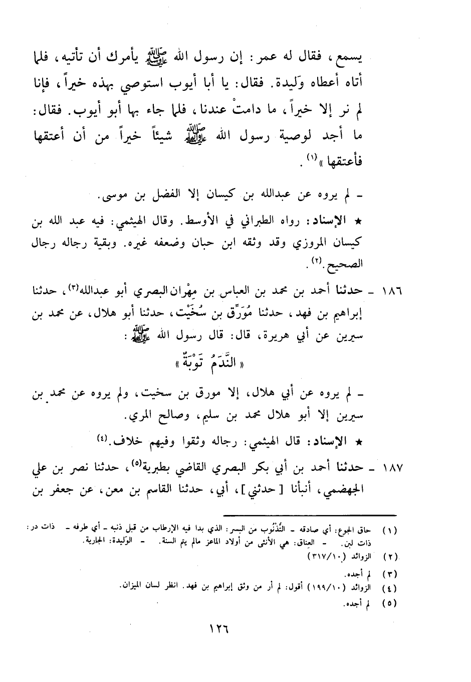 186 - حَدَّثَنَا أَحْمَدُ بْنُ مُحَمَّدِ بْنِ الْعَبَّاسِ بْنِ مِهْرَانَ الْبَصْرِيُّ أَبُو عَبْدِ اللَّهِ، حَدَّثَنَا إِبْرَاهِيمُ بْنُ فَهْدٍ، حَدَّثَنَا مُورَقُ بْنُ سُخَيْتٍ، حَدَّثَنَا أَبُو هِلَالٍ , عَنْ مُحَمَّدِ بْنِ سِيرِينَ، عَنْ أَبِي هُرَيْرَةَ قَالَ: قَالَ رَسُولُ اللَّهِ صَلَّى اللَّهُ عَلَيْهِ وَآلِهِ وَسَلَّمَ: «§النَّدَمُ تَوْبَةٌ» لَمْ يَرْوِهِ عَنْ أَبِي هِلَالٍ إِلَّا مُورَقُ بْنُ سُخَيْتٍ , وَلَمْ يَرْوِهِ عَنْ مُحَمَّدِ بْنِ سِيرِينَ إِلَّا أَبُو هِلَالٍ مُحَمَّدُ بْنُ سُلَيْمٍ وَصَالِحٌ الْمُرِّيُّ