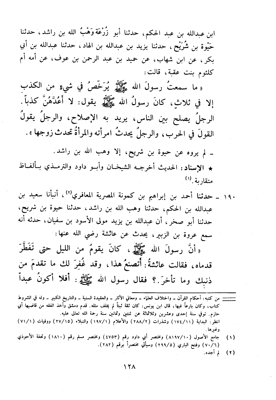 190 - حَدَّثَنَا أَحْمَدُ بْنُ إِبْرَاهِيمَ ابْنِ كَمُّونَةَ الْمِصْرِيَّةِ الْمَعَافِرِيُّ، أَنْبَأَنَا سَعِيدُ بْنُ عَبْدِ اللَّهِ بْنِ عَبْدِ الْحَكَمِ، حَدَّثَنَا وَهْبُ اللَّهِ بْنُ رَاشِدٍ، حَدَّثَنَا حَيْوَةُ بْنُ شُرَيْحٍ، حَدَّثَنَا أَبُو صَخْرٍ حُمَيْدِ بْنِ زِيَادٍ، أَنَّ عَبْدَ اللَّهِ بْنَ يَزِيدَ، مَوْلَى الْأَسْوَدِ بْنِ سُفْيَانَ , حَدَّثَهُ أَنَّهُ سَمِعَ عُرْوَةَ بْنَ الزُّبَيْرِ، يُحَدِّثُ عَنْ عَائِشَةَ رَضِيَ اللَّهُ عَنْهَا أَنَّ رَسُولَ اللَّهِ صَلَّى اللهُ عَلَيْهِ وَسَلَّمَ كَانَ يَقُومُ مِنَ اللَّيْلِ حَتَّى تَفَطَّرَ قَدَمَاهُ , فَقَالَتْ عَائِشَةُ: أَتَصْنَعُ هَذَا وَقَدْ غُفِرَ لَكَ مَا تَقَدَّمَ مِنْ ذَنْبِكَ وَمَا تَأَخَّرَ؟ , فَقَالَ رَسُولُ اللَّهِ صَلَّى اللهُ عَلَيْهِ وَسَلَّمَ: «§أَفَلَا أَكُونَ عَبْدًا شَكُورًا؟» لَمْ يَرْوِهِ عَنْ عَبْدِ اللَّهِ بْنِ يَزِيدَ مَوْلَى الْأَسْوَدِ بْنِ سُفْيَانَ إِلَّا أَبوُ صَخْرٍ , وَلَا عَنْ أَبِي صَخْرٍ إِلَّا حَيْوَةُ تَفَرَّدَ بِهِ وَهْبُ اللَّهِ بْنُ رَاشِدٍ , وَرَوَاهُ يَحْيَى بْنُ أَيُّوبَ , وَعَبْدُ اللَّهِ بْنُ وَهْبٍ , وَنَافِعُ بْنُ يَزِيدَ , عَنْ أَبِي صَخْرٍ , عَنْ يَزِيدَ بْنِ عَبْدِ اللَّهِ بْنِ قُسَيْطِ , عَنْ عُرْوَةَ