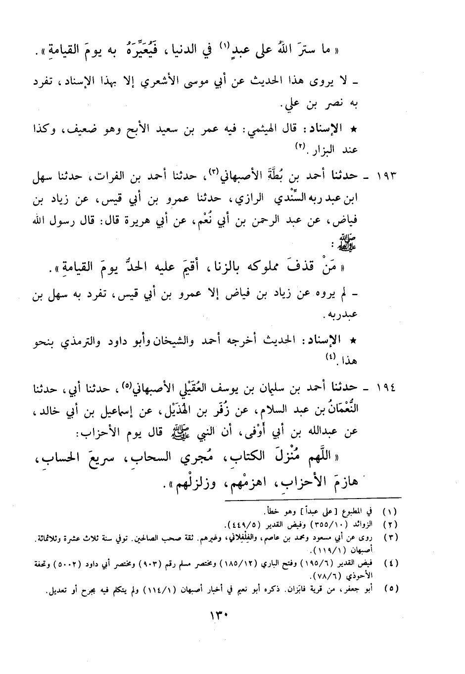 194 - حَدَّثَنَا أَحْمَدُ بْنُ سُلَيْمَانَ بْنِ يُوسُفَ الْعَقِيلِيُّ الْأَصْبَهَانِيُّ، حَدَّثَنَا أَبِي، حَدَّثَنَا النُّعْمَانُ بْنُ عَبْدِ السَّلَامِ، عَنْ زُفَرَ بْنِ الْهُذَيْلِ، عَنْ إِسْمَاعِيلَ بْنِ أَبِي خَالِدٍ، عَنْ عَبْدِ اللَّهِ بْنِ أَبِي أَوْفَى أَنَّ النَّبِيَّ صَلَّى اللهُ عَلَيْهِ وَسَلَّمَ قَالَ يَوْمَ الْأَحْزَابِ: «§اللَّهُمَّ مُنَزِّلَ الْكِتَابِ , مُجْرِيَ السَّحَابِ , سَرِيعَ الْحِسَابِ , هَازِمَ الْأَحْزَابِ اهْزِمْهُمْ وَزَلْزِلْهُمْ» لَمْ يَرْوِهِ عَنْ زُفَرَ إِلَّا النُّعْمَانُ بْنُ عَبْدِ السَّلَامِ