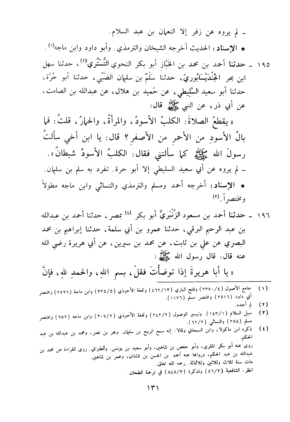 195 - حَدَّثَنَا أَحْمَدُ بْنُ مُحَمَّدِ بْنِ الْخَبَّازِ أَبُو بَكْرٍ النَّحْوِيُّ التُّسْتَرِيُّ، حَدَّثَنَا سَهْلُ بْنُ بَحْرٍ الْجُنْدِيسَابُورِيُّ، حَدَّثَنَا سَلْمُ بْنُ سُلَيْمَانَ الضَّبِّيُّ، حَدَّثَنَا أَبُو حُرَّةَ، حَدَّثَنَا أَبُو سَعِيدٍ السَّلِيطِيُّ، عَنْ حُمَيْدِ بْنِ هِلَالٍ، عَنْ عَبْدِ اللَّهِ بْنِ الصَّامِتِ، عَنْ أَبِي ذَرٍّ، عَنِ النَّبِيِّ صَلَّى اللَّهُ عَلَيْهِ وَآلِهِ وَسَلَّمَ وَآلِهِ قَالَ: " §يَقْطَعُ الصَّلَاةَ: الْكَلْبُ الْأَسْوَدُ , وَالْمَرْأَةُ , وَالْحِمَارُ " قُلْتُ: فَمَا بَالُ الْأَسْوَدِ مِنَ الْأَحْمَرِ مِنَ الْأَصْفَرِ؟ قَالَ: يَا ابْنَ أَخِي , سَأَلْتُ رَسُولَ اللَّهِ صَلَّى اللهُ عَلَيْهِ وَسَلَّمَ كَمَا سَأَلْتَنِي فَقَالَ: «الْكَلْبُ الْأَسْوَدُ شَيْطَانٌ» لَمْ يَرْوِهِ عَنْ أَبِي سَعِيدٍ السَّلِيطِيِّ إِلَّا أَبُو حُرَّةَ تَفَرَّدَ بِهِ سَلْمُ بْنُ سُلَيْمَانَ
