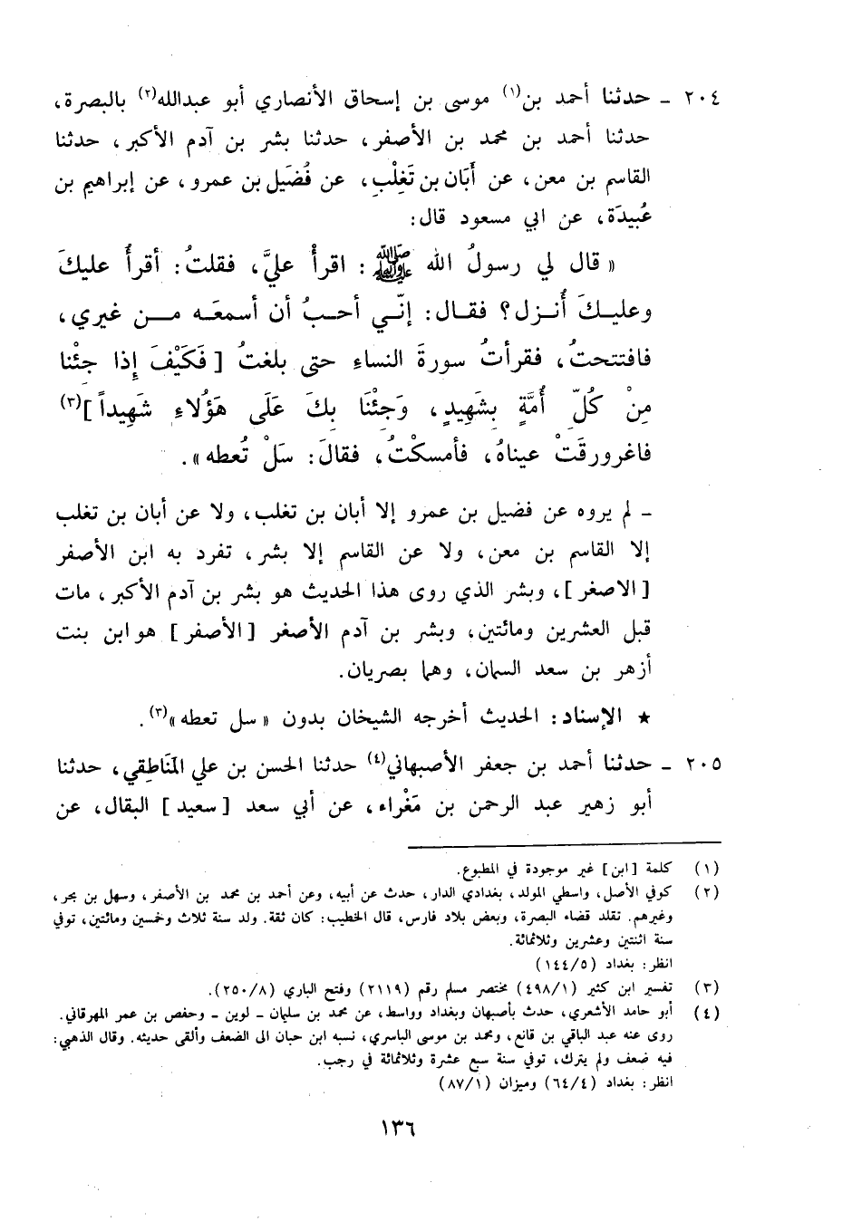 204 - حَدَّثَنَا أَحْمَدُ بْنُ مُوسَى بْنِ إِسْحَاقَ الْأَنْصَارِيُّ أَبُو عَبْدِ اللَّهِ، بِالْبَصْرَةِ , حَدَّثَنَا أَحْمَدُ بْنُ مُحَمَّدِ بْنِ الْأَصْفَرِ، حَدَّثَنَا بِشْرُ بْنُ آدَمَ الْأَكْبَرُ، حَدَّثَنَا الْقَاسِمُ بْنُ مَعْنٍ، عَنْ أَبَانَ بْنِ تَغْلِبَ، عَنْ فُضَيْلِ بْنِ عَمْرٍو، عَنْ إِبْرَاهِيمَ، عَنْ عُبَيْدَةَ، عَنْ أَبِنِ مَسْعُودٍ قَالَ: قَالَ لِي رَسُولُ اللَّهِ صَلَّى اللهُ عَلَيْهِ وَسَلَّمَ: " اقْرَأْ عَلَيَّ , فَقُلْتُ: أَقْرَأُ عَلَيْكَ وَعَلَيْكَ أُنْزِلَ؟ فَقَالَ: «§إِنِّي أُحِبُّ أَنْ أَسْمَعَهُ مِنْ غَيْرِي» , فَافْتَتَحْتُ , فَقَرَأْتُ سُورَةَ النِّسَاءِ حَتَّى بَلَغْتُ: {فَكَيْفَ إِذَا جِئْنَا مِنْ كُلِّ أُمَّةٍ بِشَهِيدٍ وَجِئْنَا بِكَ عَلَى هَؤُلَاءِ شَهِيدًا} [النساء: 41] , فَاغْرَوْرَقَتْ عَيْنَاهُ , فَأَمْسَكْتُ , فَقَالَ: «سَلْ تُعْطَهْ» لَمْ يَرْوِهِ عَنْ فُضَيْلِ بْنِ عَمْرٍو إِلَّا أَبَانُ بْنُ تَغْلِبَ , وَلَا عَنْ أَبَانَ بْنِ تَغْلِبَ إِلَّا الْقَاسِمُ بْنُ مَعْنٍ , وَلَا عَنِ الْقَاسِمِ إِلَّا بِشْرٌ تَفَرَّدَ بِهِ ابْنُ الْأَصْفَرِ , وَبِشْرٌ الَّذِي رَوَى هَذَا الْحَدِيثَ هُوَ بِشْرُ بْنُ آدَمَ الْأَكْبَرُ مَاتَ قَبْلَ الْعِشْرِينَ وَمِائَتَيْنِ , وَبِشْرُ بْنُ آدَمَ الْأَصْفَرُ هُوَ ابْنُ بِنْتِ أَزْهَرَ بْنِ سَعْدٍ السَّمَّانُ وَهُمَا بَصْرِيَّانِ