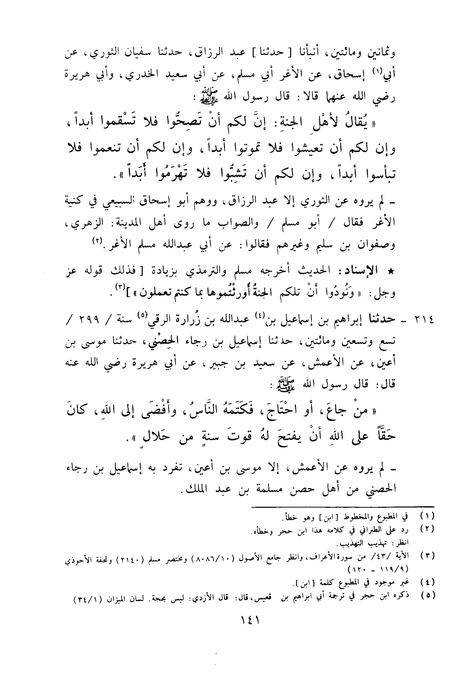 214 - حَدَّثَنَا إِبْرَاهِيمُ بْنُ إِسْمَاعِيلَ بْنِ عَبْدِ اللَّهِ بْنِ زُرَارَةَ الرَّقِّيُّ، حَدثَّنَا يَاسِينُ سَنَةَ تِسْعٍ وَتِسْعِينَ وَمِائَتَيْنِ , حَدَّثَنَا إِسْمَاعِيلُ بْنُ رَجَاءٍ الْحِصْنِيِّ، حَدَّثَنَا مُوسَى بْنُ أَعْيَنَ، عَنِ الْأَعْمَشِ، عَنْ سَعِيدِ بْنِ جُبَيْرٍ، عَنْ أَبِي هُرَيْرَةَ رَضِيَ اللَّهُ عَنْهُ قَالَ: قَالَ رَسُولُ اللَّهِ صَلَّى اللَّهُ عَلَيْهِ وَآلِهِ وَسَلَّمَ: «§مَنْ جَاعَ أَوِ احْتَاجَ , فَكَتَمَهُ النَّاسُ , وَأَفْضَى بِهِ إِلَى اللَّهِ كَانَ حَقًّا عَلَى اللَّهِ أَنْ يَفْتَحَ لَهُ قُوتَ سَنَةٍ مِنْ حَلَالٍ» لَمْ يَرْوِهِ عَنِ الْأَعْمَشِ إِلَّا مُوسَى بْنُ أَعْيَنَ تَفَرَّدَ بِهِ إِسْمَاعِيلُ بْنُ رَجَاءٍ الْحِصْنِيُّ مِنْ أَهْلِ حِصْنٍ عَنْ مَسْلَمَةَ بْنِ عَبْدِ الْمَلِكِ