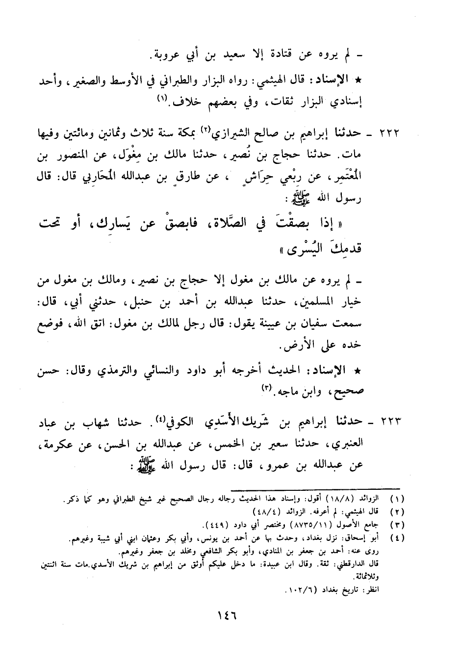 222 - حَدَّثَنَا إِبْرَاهِيمُ بْنُ صَالِحٍ الشِّيرَازِيُّ، بِمَكَّةَ سَنَةَ ثَلَاثٍ وَثَمَانِينَ وَمِائَتَيْنِ , وَفِيهَا مَاتَ , حَدَّثَنَا حَجَّاجُ بْنُ نُصَيْرٍ , حَدَّثَنَا مَالِكُ بْنُ مِغْوَلِ , عَنِ الْمَنْصُورِ بْنِ الْمُعْتَمِرِ، عَنْ رِبْعِيِّ بْنِ حِرَاشِ , عَنْ طَارِقِ بْنِ عَبْدِ اللَّهِ الْمُحَارِبِيِّ قَالَ: قَالَ رَسُولُ اللَّهِ صَلَّى اللَّهُ عَلَيْهِ وَآلِهِ وَسَلَّمَ: «§إِذَا بَصَقْتَ فِي الصَّلَاةِ فَابْصُقْ عَنْ يَسَارِكِ , أَوْ تَحْتَ قَدَمِكَ الْيُسْرَى» لَمْ يَرْوِهِ عَنْ مَالِكِ بْنِ مِغْوَلِ إِلَّا حَجَّاجُ بْنُ نُصَيْرٍ , وَمَالِكُ بْنُ مِغْوَلٍ مِنْ خِيَارِ الْمُسْلِمِينَ , حَدَّثَنَا عَبْدُ اللَّهِ بْنُ أَحْمَدَ بْنِ حَنْبَلٍ , حَدَّثَنِي أَبِي قَالَ: سَمِعْتُ سُفْيَانَ بْنَ عُيَيْنَةَ يَقُولُ: قَالَ رَجُلٌ لِمَالِكِ بْنِ مِغْوَلٍ: اتَّقِ اللَّهَ , فَوَضَعَ خَدَّهُ عَلَى الْأَرْضِ