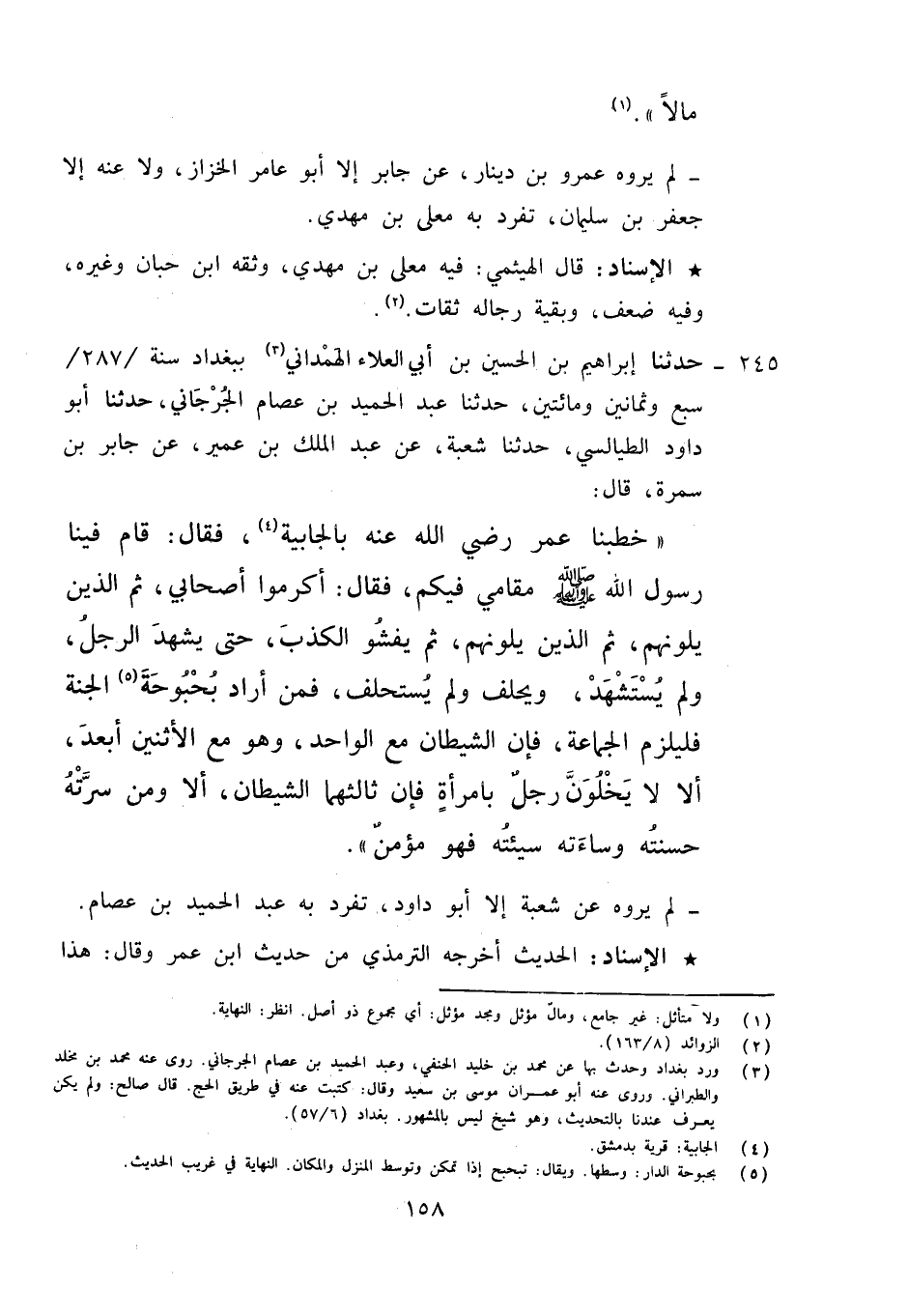 245 - حَدَّثَنَا إِبْرَاهِيمُ بْنُ الْحُسَيْنِ بْنِ أَبِي الْعَلَاءِ الْهَمْدَانِيُّ، بِبَغْدَادَ سَنَةَ 287 سَبْعٍ وَثَمَانِينَ وَمِائَتَيْنِ , حَدَّثَنَا عَبْدُ الْحَمِيدِ بْنُ عِصَامٍ الْجُرْجَانِيُّ، حَدَّثَنَا أَبُو دَاوُدَ الطَّيَالِسِيُّ، حَدَّثَنَا شُعْبَةُ، عَنْ عَبْدِ الْمَلِكِ بْنِ عُمَيْرٍ، عَنْ جَابِرِ بْنِ سَمُرَةَ قَالَ: خَطَبَنَا عُمَرُ رَضِيَ اللَّهُ عَنْهُ بِالْجَابِيَةِ فَقَالَ: قَامَ فِينَا رَسُولُ اللَّهِ صَلَّى اللَّهُ عَلَيْهِ وَآلِهِ وَسَلَّمَ مَقَامِي فِيكُمْ , فَقَالَ: «§أَكْرِمُوا أَصْحَابِي , ثُمَّ الَّذِينَ يَلُونَهُمْ , ثُمَّ الَّذِينَ يَلُونَهُمْ , ثُمَّ يَفْشُو الْكَذِبُ حَتَّى يَشْهَدَ الرَّجُلُ وَلَمْ يُسْتَشْهَدْ , وَيَحْلِفُ وَلَمْ يُسْتَحْلَفْ , فَمَنْ أَرَادَ بُحْبُوحَةَ الْجَنَّةِ فَلْيَلْزَمِ الْجَمَاعَةَ؛ فَإِنَّ الشَّيْطَانَ مَعَ الْوَاحِدِ وَهُوَ مِنَ الِاثْنَيْنِ أَبْعَدُ , أَلَا لَا يَخْلُوَنَّ رَجُلٌ بِامْرَأَةٍ فَإِنَّ ثَالِثَهُمَا الشَّيْطَانُ , أَلَا وَمَنْ سَرَّتْهُ حَسَنَتُهُ وَسَاءَتْهُ سَيِّئَتُهُ فَهُوَ مُؤْمِنٌ» لَمْ يَرْوِهِ عَنْ شُعْبَةَ إِلَّا أَبُو دَاوُدَ تَفَرَّدَ بِهِ عَبْدُ الْحَمِيدِ بْنُ عِصَامٍ