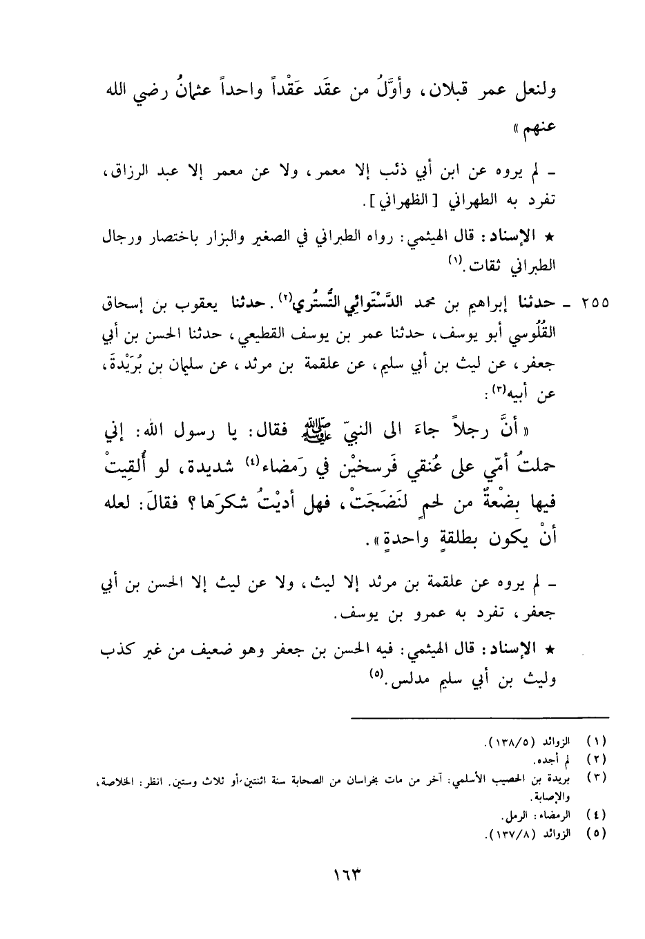 255 - حَدَّثَنَا إِبْرَاهِيمُ بْنُ مُحَمَّدٍ الدَّسْتُوَائِيُّ التُّسْتَرِيُّ , حَدَّثَنَا يَعْقُوبُ بْنُ إِسْحَاقَ الْقَلُوَسِيُّ أَبُو يُوسُفَ , حَدَّثَنَا عَمْرُو بْنُ يُوسُفَ الْقُطَعِيُّ , حَدَّثَنَا الْحَسَنُ بْنُ أَبِي جَعْفَرٍ، عْنَ لَيْثِ بْنِ أَبِي سُلَيْمٍ , عَنْ عَلْقَمَةَ بْنِ مَرْثَدٍ , عَنْ سُلَيْمَانَ بْنِ بُرَيْدَةَ , عَنْ أَبِيهِ، " أَنَّ رَجُلًا جَاءَ إِلَى النَّبِيِّ صَلَّى اللَّهُ عَلَيْهِ وَآلِهِ وَسَلَّمَ فَقَالَ: يَا رَسُولَ اللَّهِ، إِنِّي حَمَلْتُ أُمِّي عَلَى عُنُقِي فَرْسَخَيْنِ فِي رَمْضَاءَ شَدِيدَةٍ، لَوْ أَلْقَيْتَ فِيهَا بَضْعَةً مِنْ لَحْمٍ لَنَضِجَتْ، فَهَلْ أَدَّيْتُ شُكْرَهَا؟ فَقَالَ: «§لَعَلَّهُ أَنْ يَكُونَ بِطَلْقَةٍ وَاحِدَةٍ» لَمْ يَرْوِهِ عَنْ عَلْقَمَةَ بْنِ مَرْثَدٍ إِلَّا لَيْثُ، وَلَا عَنْ لَيْثٍ إِلَّا الْحَسَنُ بْنُ أَبِي جَعْفَرٍ. تَفَرَّدَ بِهِ عَمْرُو بْنُ يُوسُفَ