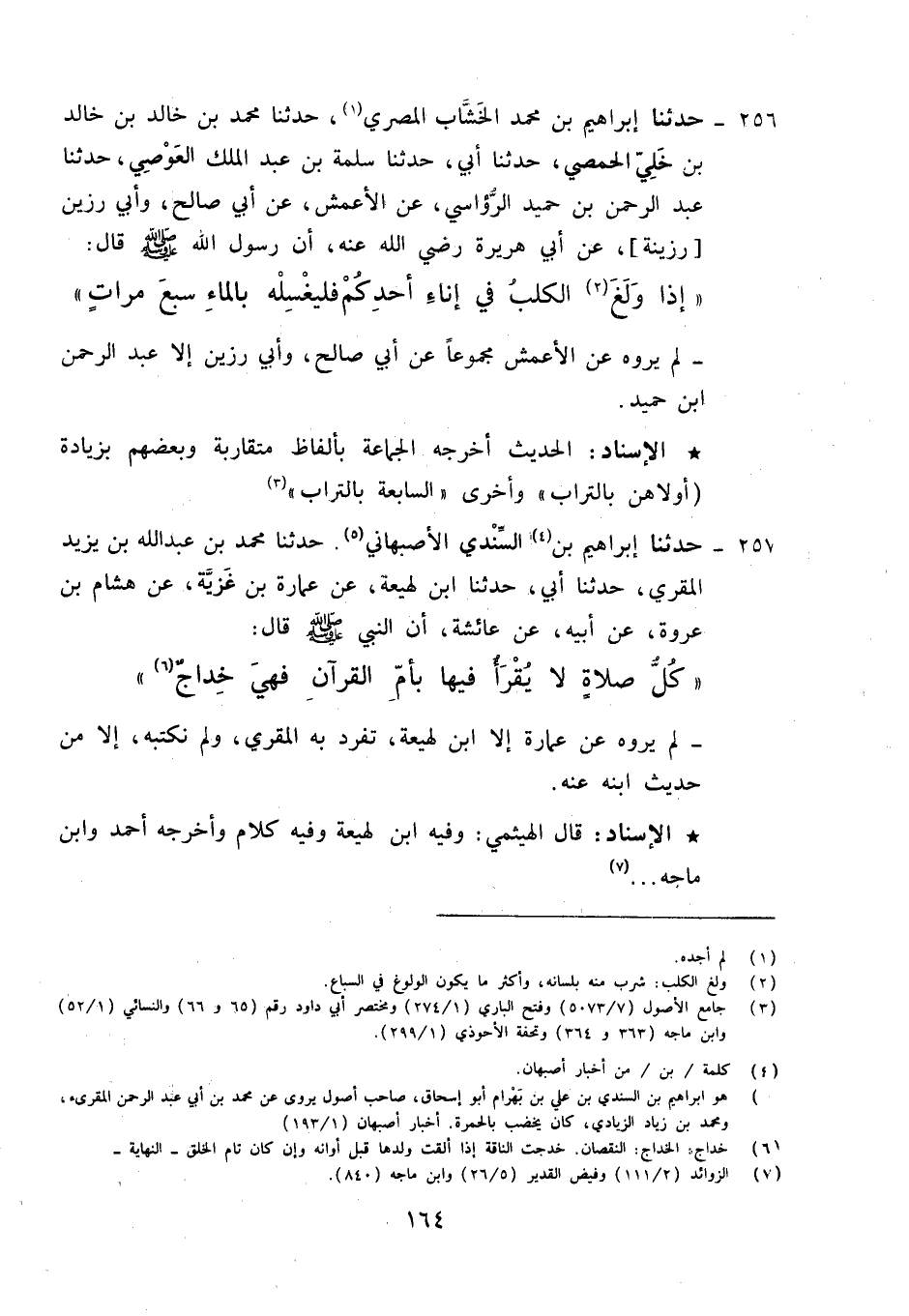 256 - حَدَّثَنَا إِبْرَاهِيمُ بْنُ مُحَمَّدٍ الْخَشَّابُ الْمِصْرِيُّ، حَدَّثَنَا مُحَمَّدُ بْنُ خَالِدِ بْنِ خَالِدِ بْنِ خَلَّى الْحِمْصِيُّ، حَدَّثَنَا أَبِي، حَدَّثَنَا سَلَمَةُ بْنُ عَبْدِ الْمَلِكِ الْعَوْصِيُّ، حَدَّثَنَا عَبْدُ الرَّحْمَنِ بْنُ حُمَيْدٍ الرُّؤَاسِيُّ، عَنِ الْأَعْمَشِ، عَنْ أَبِي صَالِحٍ، وَأَبِي رَزِينٍ , عَنْ أَبِي هُرَيْرَةَ رَضِيَ اللَّهُ عَنْهُ أَنَّ رَسُولَ اللَّهِ صَلَّى اللَّهُ عَلَيْهِ وَآلِهِ وَسَلَّمَ قَالَ: «§إِذَا وَلَغَ الْكَلْبُ فِي إِنَاءِ أَحَدِكُمْ فَلْيَغْسِلْهُ بِالْمَاءِ سَبْعَ مَرَّاتٍ» ، لَمْ يَرْوِهِ عَنِ الْأَعْمَشِ مَجْمُوعًا عَنْ أَبِي صَالِحٍ وَأَبِي رَزِينٍ إِلَّا عَبْدُ الرَّحْمَنِ بْنُ حُمَيْدٍ