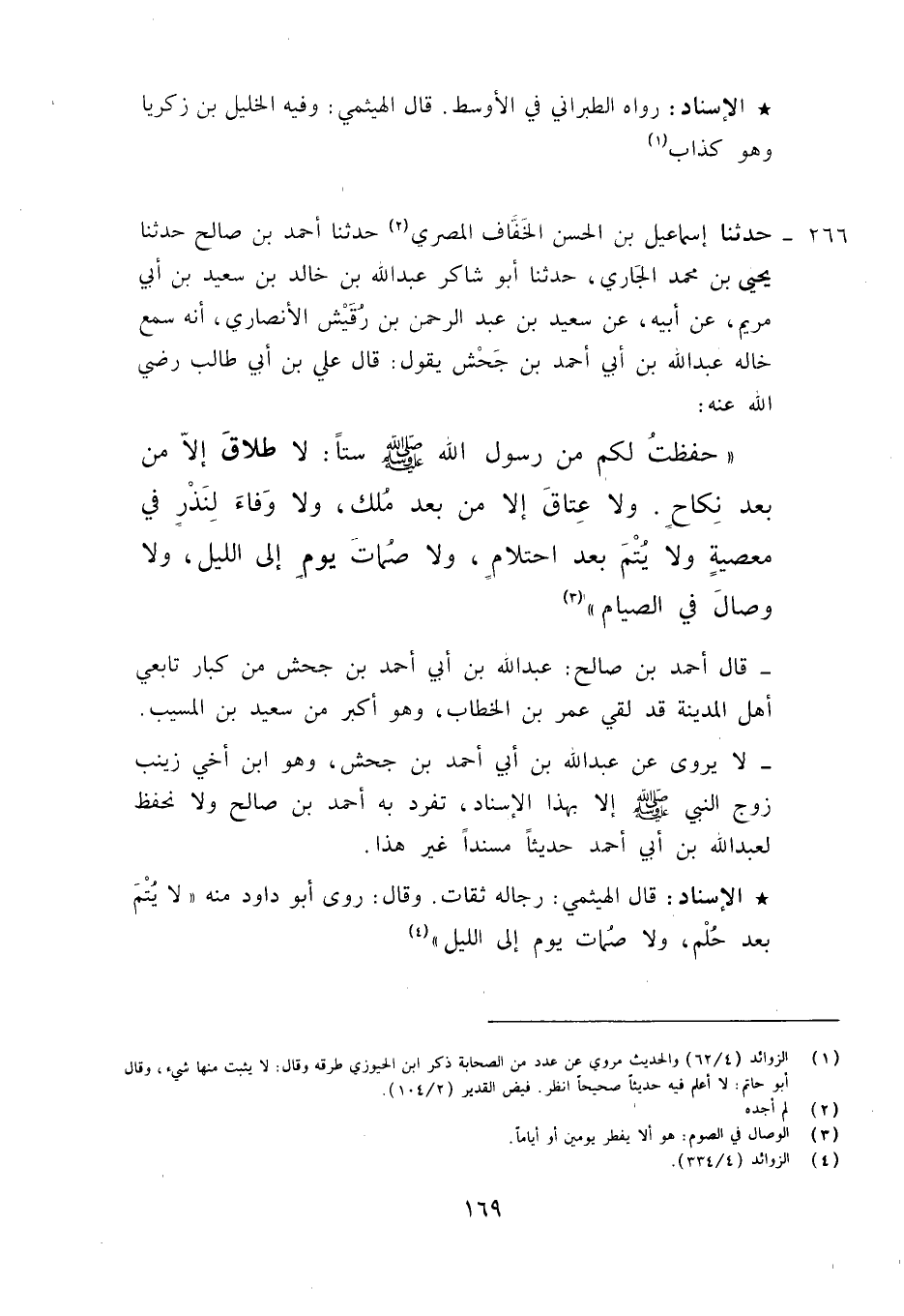 266 - حَدَّثَنَا إِسْمَاعِيلُ بْنُ الْحَسَنِ الْخَفَّافُ الْمِصْرِيُّ، حَدَّثَنَا أَحْمَدُ بْنُ صَالِحٍ، حَدَّثَنَا يَحْيَى بْنُ مُحَمَّدٍ الْجَارِيُّ، حَدَّثَنَا أَبُو شَاكِرٍ عَبْدُ اللَّهِ بْنُ خَالِدِ بْنِ سَعِيدِ بْنِ أَبِي مَرْيَمَ، عَنْ أَبِيهِ، عَنْ سَعِيدِ بْنِ عَبْدِ الرَّحْمَنِ بْنِ رُقَيْشِ الْأَنْصَارِيُّ، أَنَّهُ سَمِعَ خَالَهُ عَبْدَ اللَّهِ بْنَ أَبِي أَحْمَدَ بْنِ جَحْشٍ يَقُولُ: قَالَ عَلِيُّ بْنُ أَبِي طَالِبٍ كَرَّمَ اللَّهُ وَجْهَهُ: حَفِظْتُ لَكُمْ مِنْ رَسُولِ اللَّهِ صَلَّى اللَّهُ عَلَيْهِ وَآلِهِ وَسَلَّمَ سِتًّا: «§لَا طَلَاقَ إِلَّا مِنْ بَعْدِ نِكَاحٍ , وَلَا عَتَاقَ إِلَّا مِنْ بَعْدِ مُلْكٍ , وَلَا وَفَاءَ لِنَذْرٍ فِي مَعْصِيَةٍ , وَلَا يُتْمَ بَعْدَ احْتِلَامٍ , وَلَا صُمَاتَ يَوْمٍ إِلَى اللَّيْلِ , وَلَا وِصَالَ فِي الصِّيَامِ» قَالَ أَحْمَدُ بْنُ صَالِحٍ: عَبْدُ اللَّهِ بْنُ أَبِي أَحْمَدَ بْنِ جَحْشٍ مِنْ كِبَارِ تَابِعِي أَهْلِ الْمَدِينَةِ قَدْ لَقِيَ عُمَرَ بْنَ الْخَطَّابِ وَهُوَ أَكْبَرُ مِنْ سَعِيدِ بْنِ الْمُسَيِّبِ لَا يُرْوَى عَنْ عَبْدِ اللَّهِ بْنِ أَبِي أَحْمَدَ بْنِ جَحْشٍ وَهُوَ ابْنُ أَخِي زَيْنَبَ زَوْجِ النَّبِيِّ صَلَّى اللَّهُ عَلَيْهِ وَآلِهِ وَسَلَّمَ إِلَّا بِهَذَا الْإِسْنَادِ تَفَرَّدَ بِهِ أَحْمَدُ بْنُ صَالِحٍ , وَلَا نَحْفَظُ لِعَبْدِ اللَّهِ بْنِ أَبِي أَحْمَدَ حَدِيثًا مُسْنَدًا غَيْرَ هَذَا