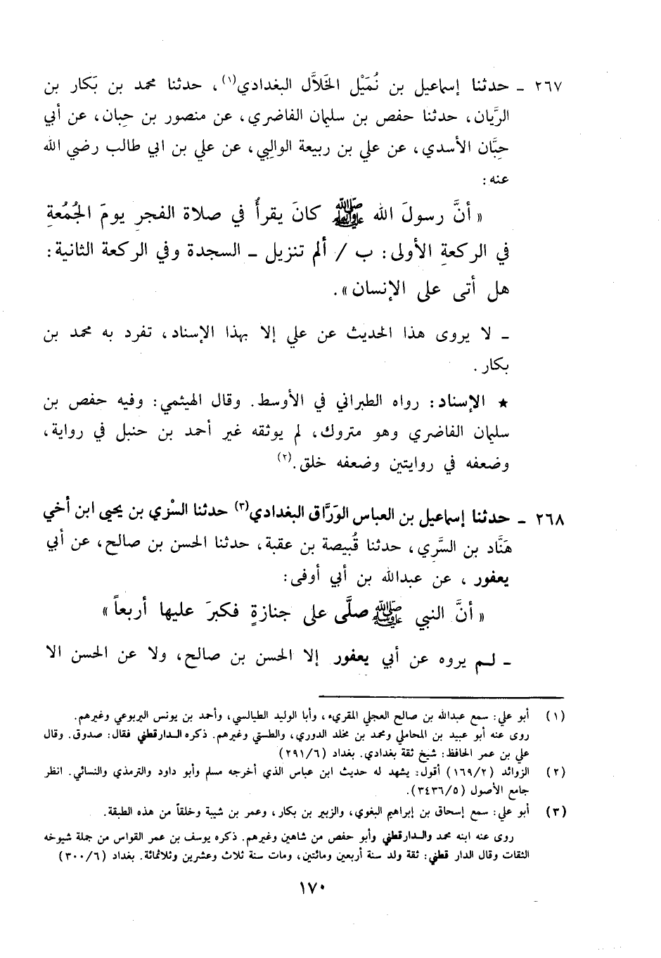 268 - حَدَّثَنَا إِسْمَاعِيلُ بْنُ الْعَبَّاسِ الْوَرَّاقُ الْبَغْدَادِيُّ، حَدَّثَنَا السَّرِيُّ بْنُ يَحْيَى ابْنُ أَخِي هَنَّادِ بْنِ السَّرِيِّ , حَدَّثَنَا قَبِيصَةُ بْنُ عُقْبَةَ، حَدَّثَنَا الْحَسَنُ بْنُ صَالِحٍ، عَنْ أَبِي يَعْفُورٍ، عَنْ عَبْدِ اللَّهِ بْنِ أَبِي أَوْفَى: أَنَّ النَّبِيَّ صَلَّى اللَّهُ عَلَيْهِ وَآلِهِ وَسَلَّمَ «§صَلَّى عَلَى جِنَازَةٍ , فَكَبَّرَ عَلَيْهَا أَرْبَعًا» لَمْ يَرْوِهِ عَنْ أَبِي يَعْفُورٍ إِلَّا الْحَسَنُ بْنُ صَالِحٍ , وَلَا عَنِ الْحَسَنِ إِلَّا قَبِيصَةُ تَفَرَّدَ بِهِ السَّرِيُّ، وَأَبُو يَعْفُورٍ اسْمُهُ: وَاقِدٌ , وَيُقَالُ: وَقْدَانُ , وَهُوَ الْأَكْبَرُ، وَأَبُو يَعْفُورٍ الْأَصْغَرُ اسْمُهُ: عَبْدُ الرَّحْمَنِ بْنُ عُبَيْدِ بْنِ نِسْطَاسٍ , وَالْحَدِيثُ الْمَشْهُورُ الَّذِي رَوَاهُ أَبُو يَعْفُورٍ عَنِ ابْنِ أَبِي أَوْفَى قَالَ: غَزَوْنَا مَعَ رَسُولِ اللَّهِ صَلَّى اللَّهُ عَلَيْهِ وَآلِهِ وَسَلَّمَ سَبْعَ غَزَوَاتٍ نَأْكُلُ فِيهِنَّ الْجَرَادَ لَمْ يَرْوِ أَبُو يَعْفُورِ بْنُ أَبِي يَحْيَى عَنِ ابْنِ أَبِي أَوْفَى إِلَّا هَذَيْنِ الْحَدِيثَيْنِ