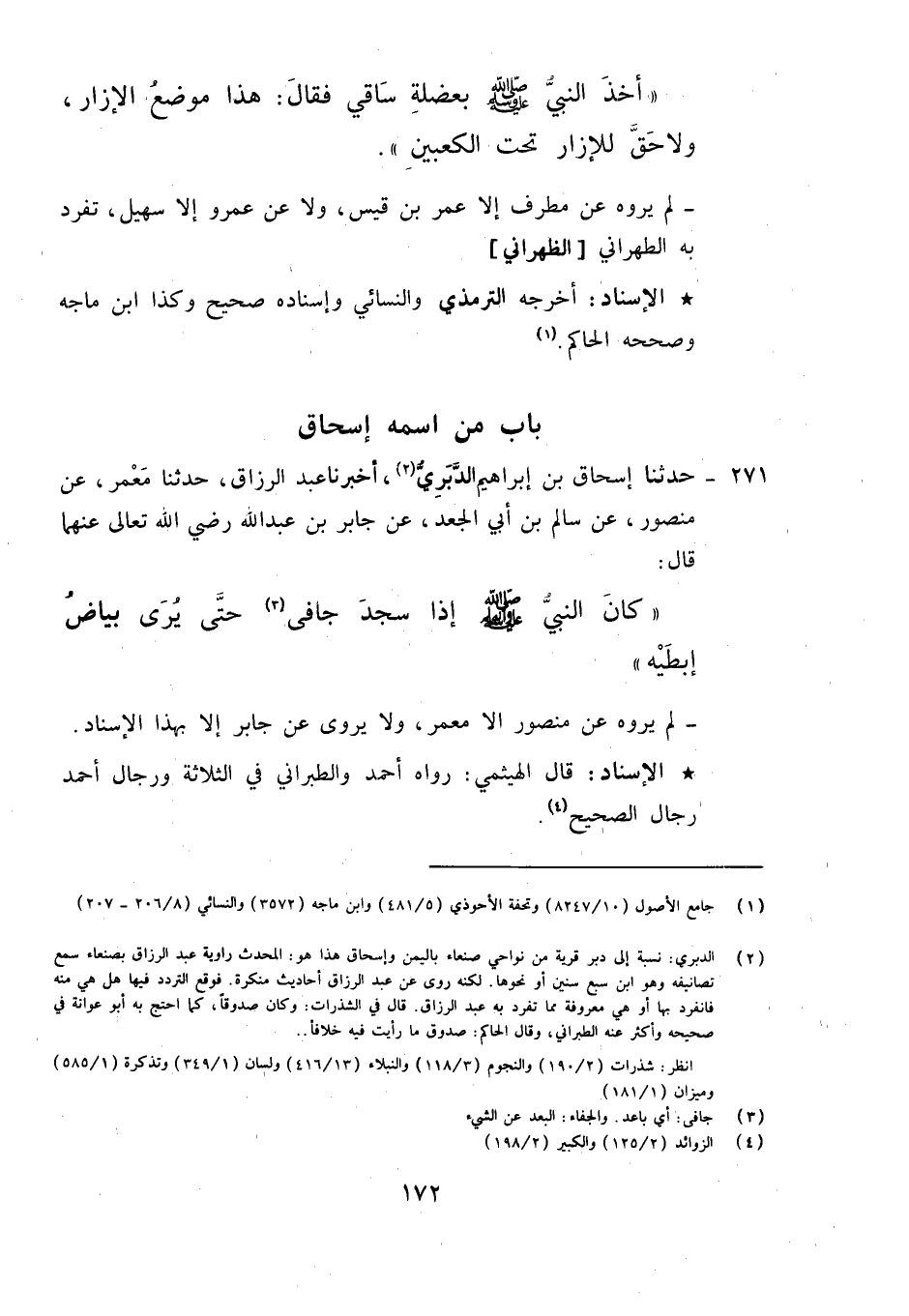 271 - حَدَّثَنَا إِسْحَاقُ بْنُ إِبْرَاهِيمَ الدَّبَرِيُّ، أَخْبَرَنَا عَبْدُ الرَّزَّاقِ، حَدَّثَنَا مَعْمَرٌ، عَنْ مَنْصُورٍ، عَنْ سَالِمِ بْنِ أَبِي الْجَعْدِ، عَنْ جَابِرِ بْنِ عَبْدِ اللَّهِ رَضِيَ اللَّهُ تَعَالَى عَنْهُمَا قَالَ: «كَانَ النَّبِيُّ صَلَّى اللَّهُ عَلَيْهِ وَآلِهِ وَسَلَّمَ §إِذَا سَجَدَ جَافَى حَتَّى يُرَى بَيَاضُ إِبِطَيْهِ» ، لَمْ يَرْوِهِ عَنْ مَنْصُورٍ إِلَّا مَعْمَرٌ , وَلَا يُرْوَى عَنْ جَابِرٍ إِلَّا بِهَذَا الْإِسْنَادِ