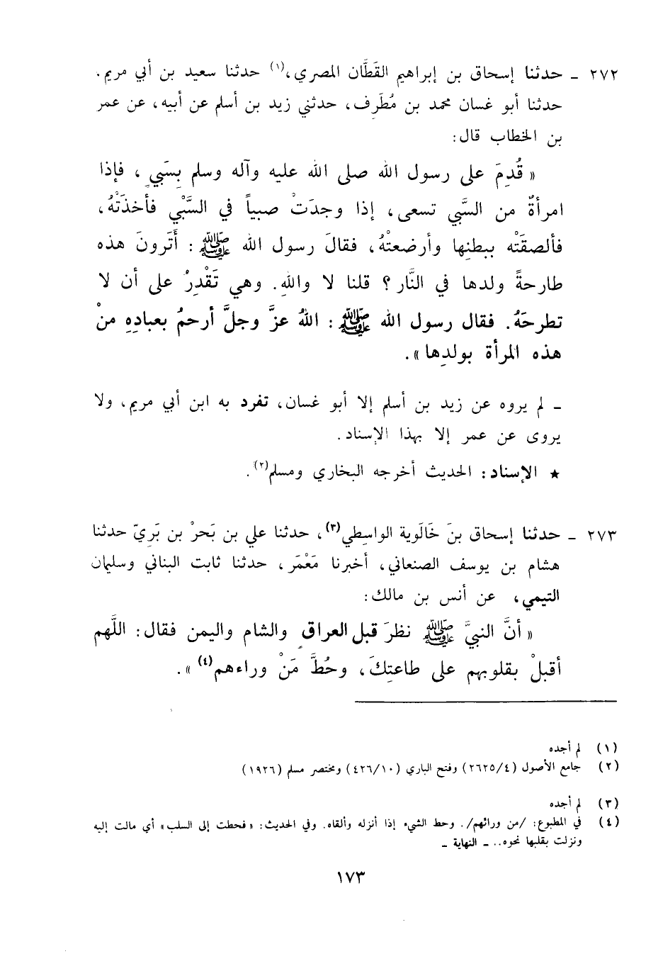 272 - حَدَّثَنَا إِسْحَاقُ بْنُ إِبْرَاهِيمَ الْقَطَّانُ الْمِصْرِيُّ، حَدَّثَنَا سَعِيدُ بْنُ أَبِي مَرْيَمَ، حَدَّثَنَا أَبُو غَسَّانَ مُحَمَّدُ بْنُ مُطَرِّفٍ , حَدَّثَنِي زَيْدُ بْنُ أَسْلَمَ، عَنْ أَبِيهِ، عَنْ عُمَرَ بْنِ الْخَطَّابِ، قَالَ: قُدِمَ عَلَى رَسُولِ اللَّهِ صَلَّى اللَّهُ عَلَيْهِ وَآلِهِ وَسَلَّمَ بِسَبْيٍ , فَإِذَا امْرَأَةٌ مِنَ السَّبْيِ تَسْعَى إِذَا وَجَدَتْ صَبِيًّا فِي السَّبْيِ فَأَخَذَتْهُ , فَأَلْصَقَتْهُ بِبَطْنِهَا وَأَرْضَعَتْهُ , فَقَالَ رَسُولُ اللَّهِ صَلَّى اللَّهُ عَلَيْهِ وَآلِهِ وَسَلَّمَ: «أَتَرَوْنَ هَذِهِ الْمَرْأَةَ طَارِحَةً وَلَدَهَا فِي النَّارِ؟» قُلْنَا: لَا وَاللَّهِ , وَهِيَ تَقْدِرُ عَلَى أَنْ لَا تَطْرَحَهُ , فَقَالَ رَسُولُ اللَّهِ صَلَّى اللَّهُ عَلَيْهِ وَآلِهِ وَسَلَّمَ: «§اللَّهُ عَزَّ وَجَلَّ أَرْحَمُ بِعِبَادِهِ مِنْ هَذِهِ الْمَرْأَةِ بِوَلَدِهَا» ، لَمْ يَرْوِهِ عَنْ زَيْدِ بْنِ أَسْلَمَ إِلَّا أَبُو غَسَّانُ تَفَرَّدَ بِهِ ابْنُ أَبِي مَرْيَمَ , وَلَا يُرْوَى عَنْ عُمَرَ إِلَّا بِهَذَا الْإِسْنَادِ