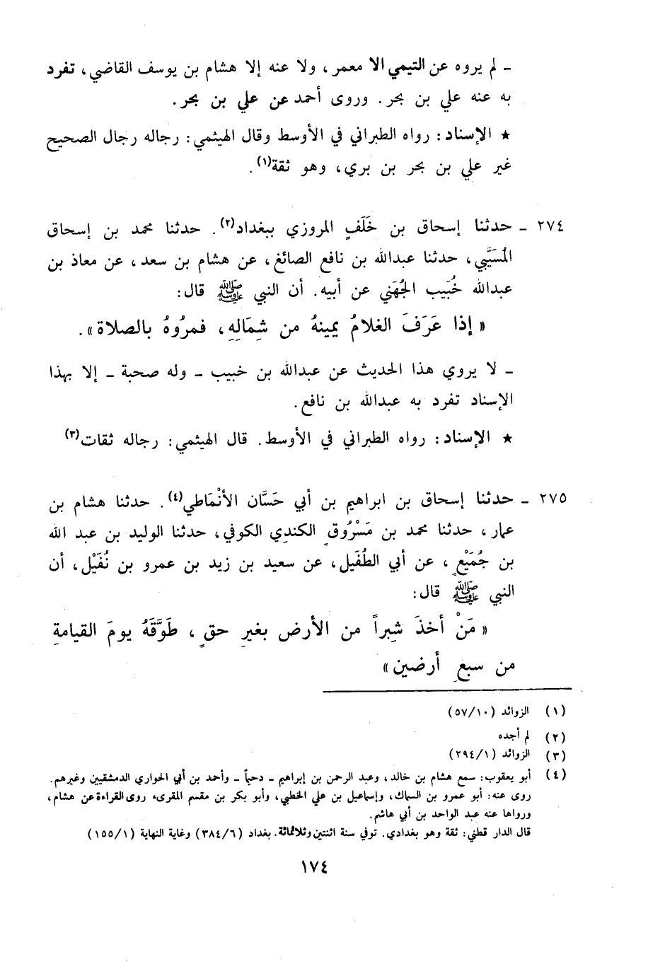 275 - حَدَّثَنَا إِسْحَاقُ بْنُ إِبْرَاهِيمَ بْنِ أَبِي حَسَّانَ الْأَنْمَاطِيُّ، حَدَّثَنَا هِشَامُ بْنُ عَمَّارٍ، حَدَّثَنَا مُحَمَّدُ بْنُ مَسْرُوقٍ الْكِنْدِيُّ الْكُوفِيُّ، حَدَّثَنَا الْوَلِيدُ بْنُ عَبْدِ اللَّهِ بْنِ جُمَيْعٍ، عَنْ أَبِي الطُّفَيْلِ، عَنْ سَعِيدِ بْنِ زَيْدِ بْنِ عَمْرِو بْنِ نُفَيْلٍ أَنَّ النَّبِيَّ صَلَّى اللَّهُ عَلَيْهِ وَآلِهِ وَسَلَّمَ قَالَ: «§مَنْ أَخَذَ شِبْرًا مِنَ الْأَرْضِ بِغَيْرِ حَقٍّ طُوِّقَهُ يَوْمَ الْقِيَامَةِ مِنْ سَبْعِ أَرَضِينَ» لَمْ يَرْوِهِ عَنْ أَبِي طُفَيْلٍ عَامِرِ بْنِ وَاثِلَةَ إِلَّا الْوَلِيدُ بْنُ عَبْدِ اللَّهِ تَفَرَّدَ بِهِ مُحَمَّدُ بْنُ مَسْرُوقٍ