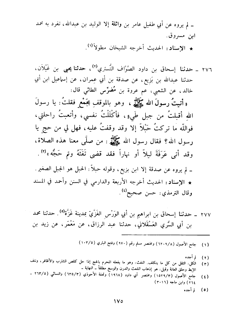 276 - حَدَّثَنَا إِسْحَاقُ بْنُ دَاوُدَ الصَّوَّافُ التُّسْتَرِيُّ، حَدَّثَنَا يَحْيَى بْنُ غَيْلَانَ، حَدَّثَنَا عَبْدُ اللَّهِ بْنُ بَزِيعٍ، عَنْ صَدَقَةَ بْنِ أَبِي عِمْرَانَ، عَنْ إِسْمَاعِيلَ بْنِ أَبِي خَالِدٍ، عَنِ الشَّعْبِيِّ، عَنْ عُرْوَةَ بْنِ مُضَرِّسٍ الطَّائِيِّ قَالَ: " أَتَيْتُ رَسُولَ اللَّهِ صَلَّى اللَّهُ عَلَيْهِ وَآلِهِ وَسَلَّمَ وَهُوَ بِالْمَوْقِفِ بِجَمْعٍ , فَقُلْتُ: يَا رَسُولَ اللَّهِ , أَقْبَلْتُ مِنْ جَبَلِ طَيِّئٍ , فَأَكْلَلْتُ نَفْسِي , وَأَتْعَبْتُ رَاحِلَتِي , فَوَاللَّهِ مَا تَرَكْتُ حَبْلًا إِلَّا وَقَدْ وَقَفْتُ عَلَيْهِ , فَهَلْ لِي مِنْ حَجٍّ يَا رَسُولَ اللَّهِ؟ فَقَالَ رَسُولُ اللَّهِ صَلَّى اللَّهُ عَلَيْهِ وَآلِهِ وَسَلَّمَ: «§مَنْ صَلَّى مَعَنَا هَذِهِ الصَّلَاةَ , وَقَدْ أَتَى عَرَفَةَ لَيْلًا أَوْ نَهَارًا فَقَدْ قَضَى تَفَثَهُ وَتَمَّ حَجَّهُ» لَمْ يَرْوِهِ عَنْ صَدَقَةَ إِلَّا ابْنُ بَزِيعٍ , وَقَوْلُهُ حَبْلًا , الْحَبْلُ هُوَ الْجَبَلُ الصَّغِيرُ