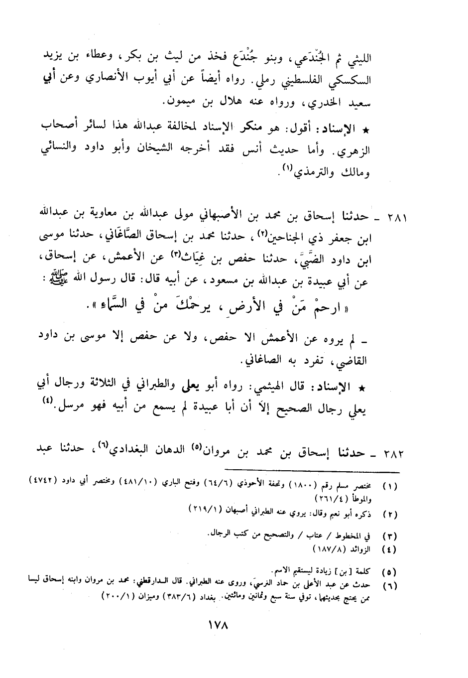 281 - حَدَّثَنَا إِسْحَاقُ بْنُ مُحَمَّدِ بْنِ الْأَصْبَهَانِيُّ، مَوْلَى عَبْدِ اللَّهِ بْنِ مُعَاوِيَةَ بْنِ عَبْدِ اللَّهِ بْنِ جَعْفَرٍ ذِي الْجَنَاحَيْنِ , حَدَّثَنَا مُحَمَّدُ بْنُ إِسْحَاقَ الصَّاغَانِيُّ، حَدَّثَنَا مُوسَى بْنُ دَاوُدَ الضَّبِّيُّ، حَدَّثَنَا حَفْصُ بْنُ غِيَاثٍ، عَنِ الْأَعْمَشِ، عَنْ أَبِي إِسْحَاقَ، عَنْ أَبِي عُبَيْدَةَ بْنِ عَبْدِ اللَّهِ بْنِ مَسْعُودٍ، عَنْ أَبِيهِ قَالَ: قَالَ رَسُولُ اللَّهِ صَلَّى اللَّهُ عَلَيْهِ وَآلِهِ وَسَلَّمَ: «§ارْحَمْ مَنْ فِي الْأَرْضِ يَرْحَمْكَ مَنْ فِي السَّمَاءِ» لَمْ يَرْوِهِ عَنِ الْأَعْمَشِ إِلَّا حَفْصٌ , وَلَا عَنْ حَفْصٍ إِلَّا مُوسَى بْنُ دَاوُدَ الْقَاضِي تَفَرَّدَ بِهِ الصَّاغَانِيُّ