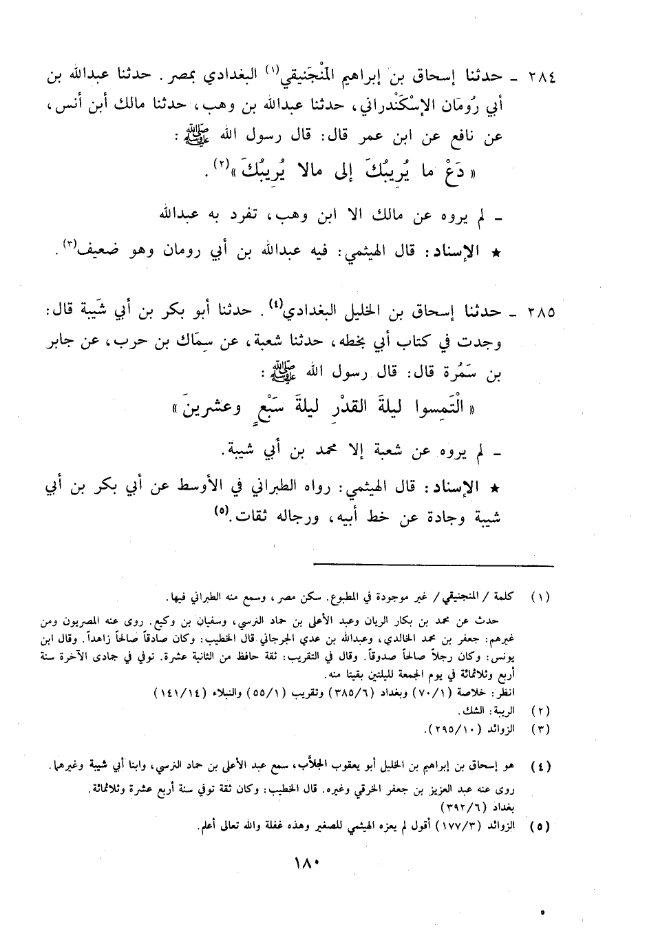 284 - حَدَّثَنَا إِسْحَاقُ بْنُ إِبْرَاهِيمَ الْمَنْجَنِيقِيُّ الْبَغْدَادِيُّ، بِمِصْرَ , حَدَّثَنَا عَبْدُ اللَّهِ بْنُ أَبِي رُومَانَ الْإِسْكَنْدَرَانِيُّ، حَدَّثَنَا عَبْدُ اللَّهِ بْنُ وَهْبٍ، حَدَّثَنَا مَالِكُ بْنُ أَنَسٍ، عَنْ نَافِعٍ، عَنِ ابْنِ عُمَرَ قَالَ: قَالَ رَسُولُ اللَّهِ صَلَّى اللَّهُ عَلَيْهِ وَآلِهِ وَسَلَّمَ: «§دَعْ مَا يَرِيبُكَ إِلَى مَالَا يَرِيبُكَ» لَمْ يَرْوِهِ عَنْ مَالِكٍ إِلَّا ابْنُ وَهْبٍ تَفَرَّدَ بِهِ عَبْدُ اللَّهِ بْنُ رُومَانَ
