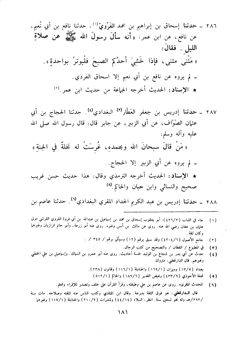 287 - حَدَّثَنَا إِدْرِيسُ بْنُ جَعْفَرٍ الْقَطَّانُ الْبَغْدَادِيُّ، حَدَّثَنَا رَوْحُ بْنُ عُبَادَةَ، حَدَّثَنَا الْحَجَّاجُ بْنُ أَبِي عُثْمَانَ الصَّوَّافُ، عَنْ أَبِي الزُّبَيْرِ، عَنْ جَابِرٍ قَالَ: قَالَ رَسُولُ اللَّهِ صَلَّى اللَّهُ عَلَيْهِ وَآلِهِ وَسَلَّمَ: «§مَنْ قَالَ سُبْحَانَ اللَّهِ وَبِحَمْدِهِ غُرِسَتْ لَهُ نَخْلَةٌ فِي الْجَنَّةِ» لَمْ يَرْوِهِ عَنْ أَبِي الزُّبَيْرِ إِلَّا الْحَجَّاجُ