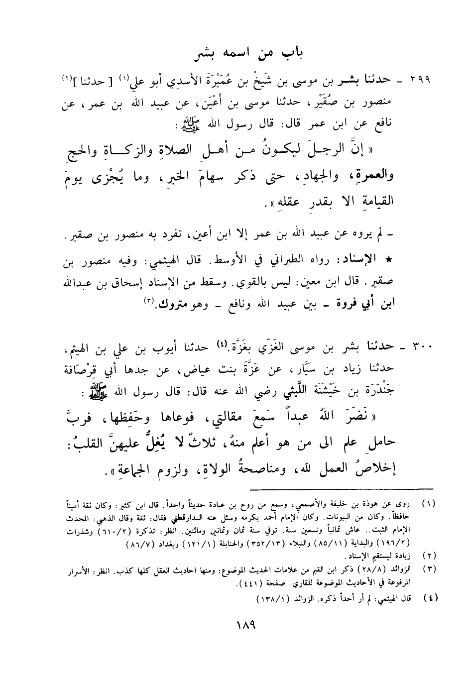 299 - حَدَّثَنَا بِشْرُ بْنُ مُوسَى بْنِ شَيْخِ بْنِ عَمِيرَةَ الْأَسَدِيُّ أَبُو عَلِيٍّ، حَدَّثَنَا مَنْصُورُ بْنُ صُقَيْرٍ، حَدَّثَنَا مُوسَى بْنُ أَعْيَنَ، عَنْ عُبَيْدِ اللَّهِ بْنِ عُمَرَ، عَنْ نَافِعٍ، عَنِ ابْنِ عُمَرَ قَالَ: قَالَ رَسُولُ اللَّهِ صَلَّى اللَّهُ عَلَيْهِ وَآلِهِ وَسَلَّمَ: «إِنَّ الرَّجُلَ لَيَكُونُ مِنْ أَهْلِ الصَّلَاةِ وَالزَّكَاةِ وَالْحَجِّ وَالْعُمْرَةِ وَالْجِهَادِ حَتَّى ذَكَرَ سِهَامَ الْخَيْرِ , §وَمَا يُجْزَى يَوْمَ الْقِيَامَةِ إِلَّا بِقَدْرِ عَقْلِهِ» ، لَمْ يَرْوِهِ عَنْ عُبَيْدِ اللَّهِ بْنِ عُمَرَ إِلَّا ابْنُ أَعْيَنَ تَفَرَّدَ بِهِ مَنْصُورُ بْنُ صُقَيْرٍ