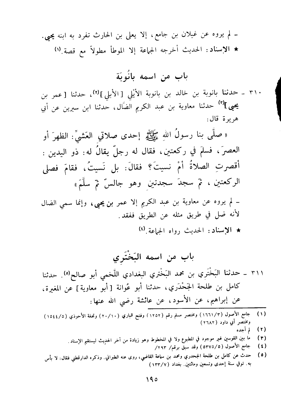 310 - حَدَّثَنَا بَانُوبَةُ بْنُ خَالِدِ بْنِ بَانُوبَةَ الْأَيْلِيُّ (الْأُبُلِّيُّ) ، حَدَّثَنَا مُعَاوِيَةُ بْنُ عَبْدِ الْكَرِيمِ الضَّالُّ، حَدَّثَنَا ابْنُ سِيرِينَ، عَنْ أَبِي هُرَيْرَةَ قَالَ: صَلَّى بِنَا رَسُولُ اللَّهِ صَلَّى اللَّهُ عَلَيْهِ وَآلِهِ وَسَلَّمَ إِحْدَى صَلَاتَيِ الْعَشِيِّ الظُّهْرَ أَوِ الْعَصْرَ فَسَلَّمَ فِي رَكْعَتَيْنِ , فَقَالَ لَهُ رَجُلٌ يُقَالُ لَهُ ذُو الْيَدَيْنِ: §أَقَصَرْتَ الصَّلَاةَ أَمْ نَسِيتَ؟ فَقَالَ: «بَلْ نَسِيتُ» , فَقَامَ فَصَلَّى الرَّكْعَتَيْنِ , ثُمَّ سَجَدَ سَجْدَتَيْنِ وَهُوَ جَالِسٌ ثُمَّ سَلَّمَ، لَمْ يَرْوِهِ عَنْ مُعَاوِيَةَ بْنِ عَبْدِ الْكَرِيمِ إِلَّا عُمَرُ بْنُ يَحْيَى , وَإِنَّمَا سُمَيَّ مُعَاوِيَةَ الضَّالَّ؛ لِأَنَّهُ ضَلَّ فِي طَرِيقِ مَكَّةَ عَنِ الطَّرِيقِ فَفُقِدَ