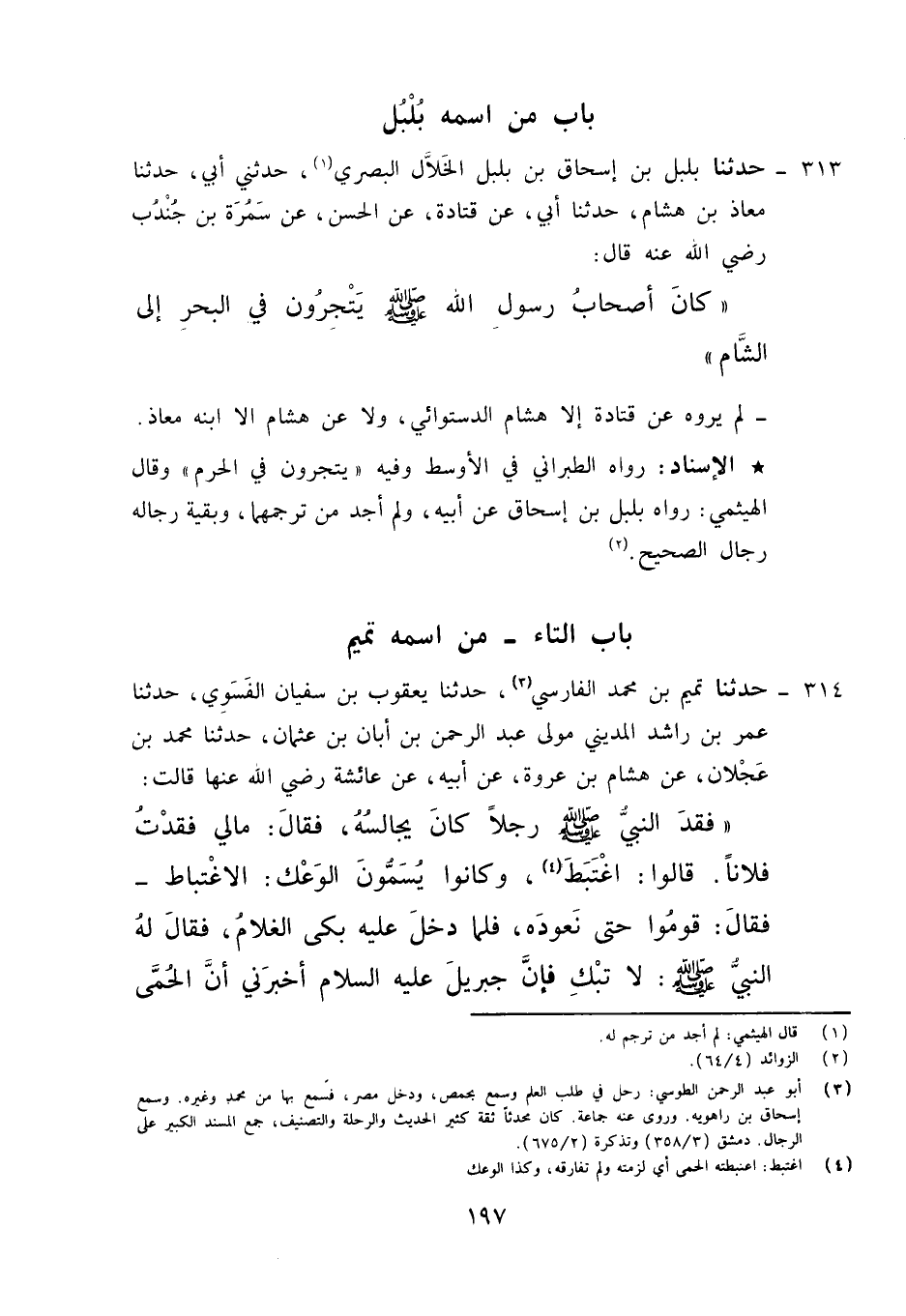 313 - حَدَّثَنَا بُلْبُلُ بْنُ إِسْحَاقَ بْنِ بُلْبُلٍ الْخَلَّالُ الْبَصْرِيُّ، حَدَّثَنِي أَبِي، حَدَّثَنَا مُعَاذُ بْنُ هِشَامٍ، حَدَّثَنَا أَبِي، عَنْ قَتَادَةَ، عَنِ الْحَسَنِ، عَنْ سَمُرَةَ بْنِ جُنْدُبٍ، رَضِيَ اللَّهُ عَنْهُ قَالَ: «§كَانَ أَصْحَابُ رَسُولِ اللَّهِ صَلَّى اللَّهُ عَلَيْهِ وَآلِهِ وَسَلَّمَ يَتَّجِرُونَ فِي الْبَحْرِ إِلَى الشَّامِ» لَمْ يَرْوِهِ عَنْ قَتَادَةَ إِلَّا هِشَامُ الدَّسْتُوَائِيُّ , وَلَا عَنْ هِشَامٍ إِلَّا ابْنُهُ مُعَاذٌ