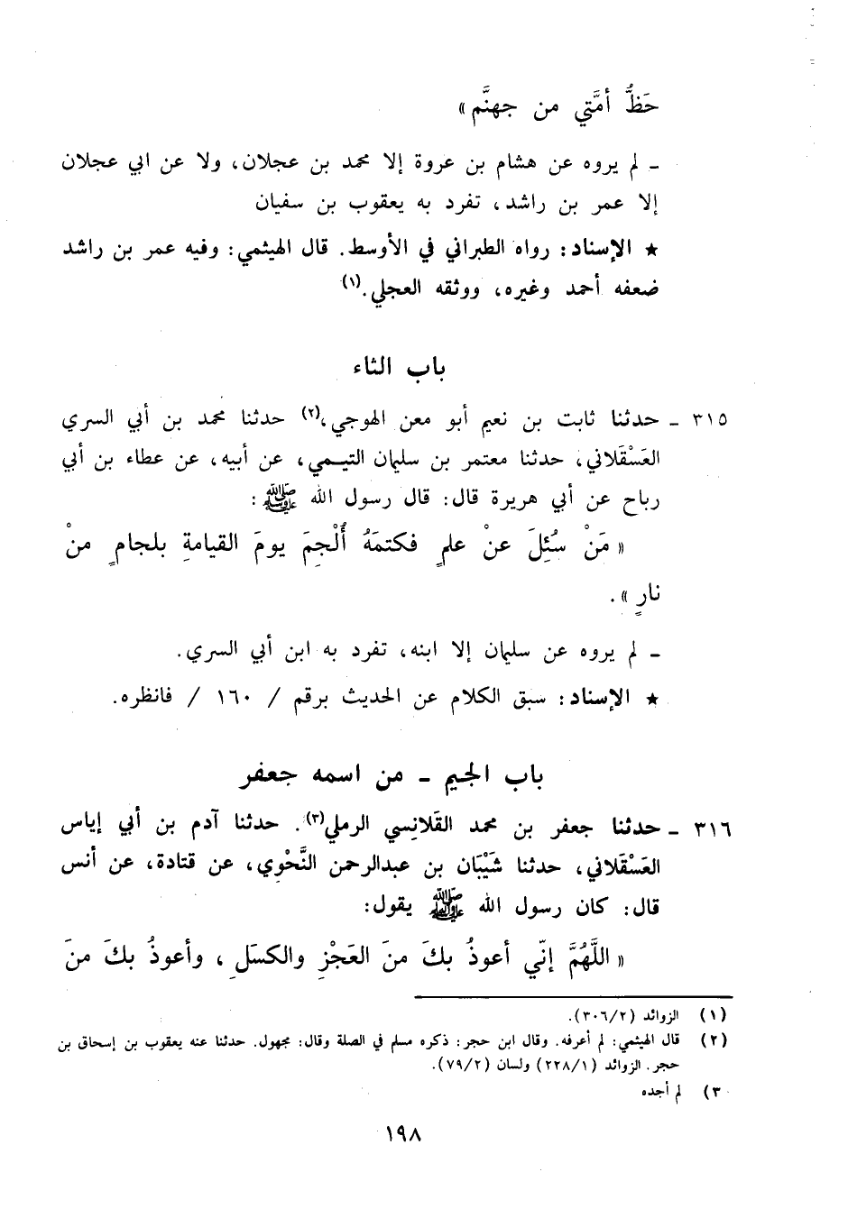 315 - حَدَّثَنَا ثَابِتُ بْنُ نُعَيْمٍ أَبُو مَعْنٍ الْهَوْجِيُّ، حَدَّثَنَا مُحَمَّدُ بْنُ أَبِي السَّرِيِّ الْعَسْقَلَانِيُّ، حَدَّثَنَا مُعْتَمِرُ بْنُ سُلَيْمَانَ التَّيْمِيُّ، عَنْ أَبِيهِ، عَنْ عَطَاءِ بْنِ أَبِي رَبَاحٍ، عَنْ أَبِي هُرَيْرَةَ رَضِيَ اللهُ عَنْهُ قَالَ: قَالَ رَسُولُ اللَّهِ صَلَّى اللهُ عَلَيْهِ وَسَلَّمَ: «§مَنْ سُئِلَ عَنْ عِلْمٍ فَكَتَمَهُ , أُلْجِمَ يَوْمَ الْقِيَامَةِ بِلِجَامٍ مِنْ نَارٍ» لَمْ يَرْوِهِ عَنْ سُلَيْمَانَ إِلَّا ابْنُهُ تَفَرَّدَ بِهِ ابْنُ أَبِي السَّرِيِّ