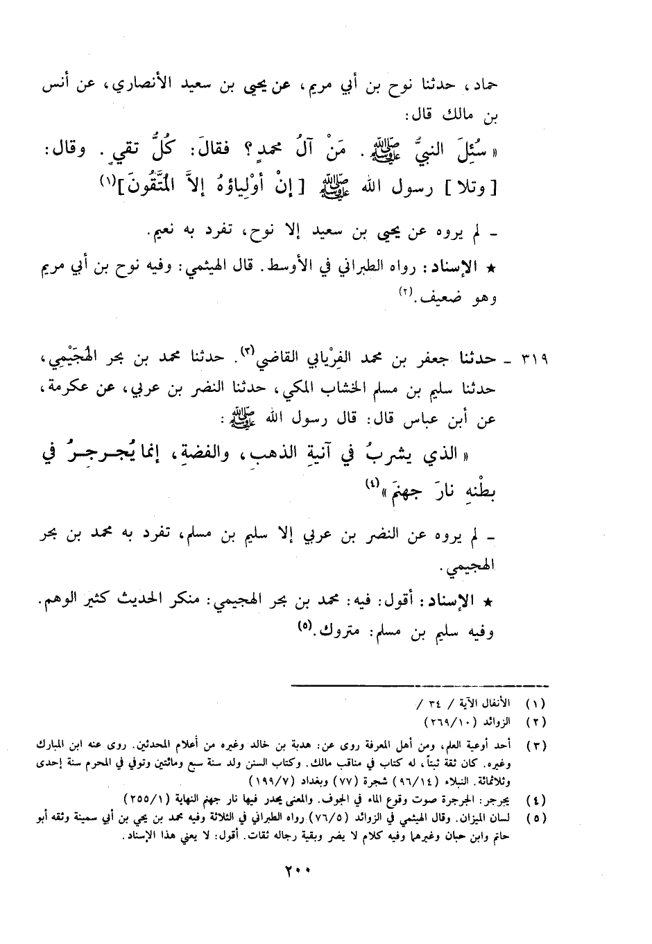 319 - حَدَّثَنَا جَعْفَرُ بْنُ مُحَمَّدٍ الْفِرْيَابِيُّ الْقَاضِي، حَدَّثَنَا مُحَمَّدُ بْنُ بَحْرٍ الْهُجَيْمِيُّ، حَدَّثَنَا سُلَيْمُ بْنُ مُسْلِمٍ الْخَشَّابُ الْمَكِّيُّ، حَدَّثَنَا النَّضْرُ بْنُ عَرَبِيٍّ، عَنْ عِكْرِمَةَ، عَنِ ابْنِ عَبَّاسٍ قَالَ: قَالَ رَسُولُ اللَّهِ صَلَّى اللَّهُ عَلَيْهِ وَآلِهِ وَسَلَّمَ: «§الَّذِي يَشْرَبُ فِي آنِيَةِ الذَّهَبِ وَالْفِضَّةِ إِنَّمَا يُجَرْجِرُ فِي بَطْنِهِ نَارَ جَهَنَّمَ» لَمْ يَرْوِهِ عَنِ النَّضْرِ بْنِ عَرَبِيٍّ إِلَّا سُلَيْمُ بْنُ مُسْلِمٍ تَفَرَّدَ بِهِ مُحَمَّدُ بْنُ بَحْرٍ الْهُجَيْمِيُّ