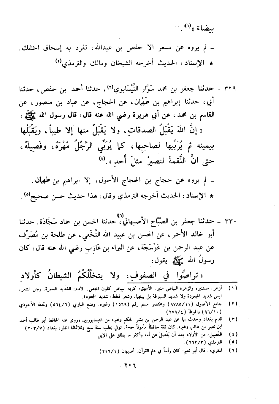 329 - حَدَّثَنَا جَعْفَرُ بْنُ مُحَمَّدِ بْنِ سَوَّارٍ النَّيْسَابُورِيُّ , حَدَّثَنَا أَحْمَدُ بْنُ حَفْصٍ، حَدَّثَنَا أَبِي، حَدَّثَنَا إِبْرَاهِيمُ بْنُ طَهْمَانَ، عَنِ الْحَجَّاجِ بْنِ الْحَجَّاجِ، عَنْ عَبَّادِ بْنِ مَنْصُورٍ، عَنِ الْقَاسِمِ بْنِ مُحَمَّدٍ، عَنْ أَبِي هُرَيْرَةَ رَضِيَ اللَّهُ عَنْهُ قَالَ: قَالَ رَسُولُ اللَّهِ صَلَّى اللَّهُ عَلَيْهِ وَآلِهِ وَسَلَّمَ: «§إِنَّ اللَّهَ يَقْبَلُ الصَّدَقَاتِ , وَلَا يَقْبَلُ مِنْهَا إِلَّا طَيِّبًا , وَيَقْبَلُهَا بِيَمِينِهِ , ثُمَّ يُرَبِّيهَا لِصَاحِبِهَا كَمَا يُرَبِّي الرَّجُلُ مُهْرَهُ وَفَصِيلَهُ حَتَّى أَنَّ اللُّقْمَةَ لَتَصِيرُ مِثْلَ أُحُدٍ» لَمْ يَرْوِهِ عَنِ الْحَجَّاجِ بْنِ الْحَجَّاجِ الْأَحْوَلِ إِلَّا إِبْرَاهِيمُ بْنُ طَهْمَانَ
