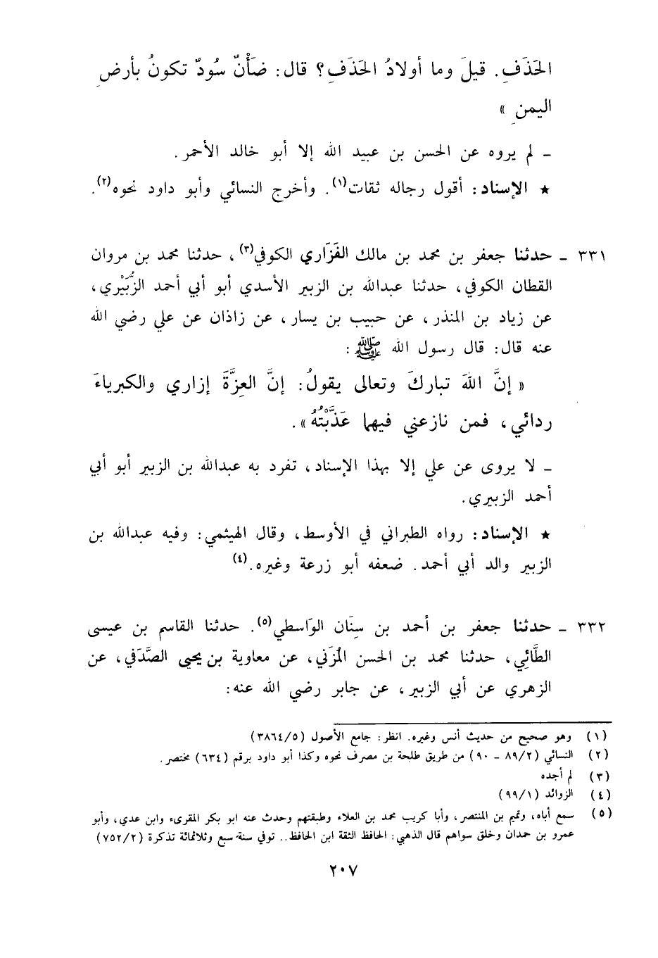 331 - حَدَّثَنَا جَعْفَرُ بْنُ مُحَمَّدِ بْنِ مَالِكٍ الْفَزَارِيُّ الْكُوفِيُّ، حَدَّثَنَا مُحَمَّدُ بْنُ مَرْوَانَ الْقَطَّانُ الْكُوفِيُّ، حَدَّثَنَا عَبْدُ اللَّهِ بْنُ الزُّبَيْرِ الْأَسَدِيُّ أَبُو أَبِي أَحْمَدَ، عَنْ زِيَادِ بْنِ الْمُنْذِرِ، عَنْ حَبِيبِ بْنِ يَسَارٍ، عَنْ زَاذَانَ، عَنْ عَلِيٍّ كَرَّمَ اللَّهُ وَجْهَهُ فِي الْجَنَّةِ قَالَ: قَالَ رَسُولُ اللَّهِ صَلَّى اللَّهُ عَلَيْهِ وَآلِهِ وَسَلَّمَ: إِنَّ اللَّهُ تَبَارَكَ وَتَعَالَى يَقُولُ: «إِنَّ §الْعِزَّةَ إِزَارِي , وَالْكِبْرِيَاءُ رِدَائِي , فَمَنْ نَازَعَنِي فِيهِمَا عَذَّبْتُهُ» لَا يُرْوَى عَنْ عَلِيٍّ إِلَّا بِهَذَا الْإِسْنَادِ تَفَرَّدَ بِهِ عَبْدُ اللَّهِ بْنُ الزُّبَيْرِ أَبُو أَبِي أَحْمَدَ الزُّبَيْرِيِّ