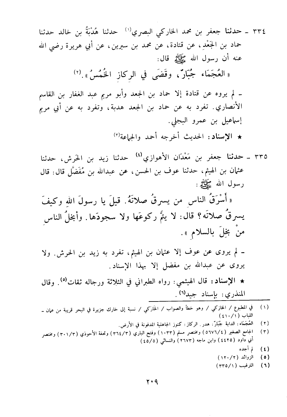 335 - حَدَّثَنَا جَعْفَرُ بْنُ مَعْدَانَ الْأَهْوَازِيُّ، حَدَّثَنَا زَيْدُ بْنُ الْحَرِيشِ، حَدَّثَنَا عُثْمَانُ بْنُ الْهَيْثَمِ، حَدَّثَنَا عَوْفٌ، عَنِ الْحَسَنِ، عَنْ عَبْدِ اللَّهِ بْنِ مُغَفَّلٍ قَالَ: قَالَ رَسُولُ اللَّهِ صَلَّى اللهُ عَلَيْهِ وَسَلَّمَ: «§أَسْرَقُ النَّاسِ مَنْ يَسْرِقُ صَلَاتَهُ» , قِيلَ: يَا رَسُولَ اللَّهِ , وَكَيْفَ يَسْرِقُ صَلَاتَهُ؟ قَالَ: «لَا يُتِمُّ رُكُوعَهَا , وَلَا سُجُودَهَا , وَأَبْخَلُ النَّاسِ مَنْ بَخِلَ بِالسَّلَامِ» لَمْ يَرْوِهِ عَنْ عَوْفٍ إِلَّا عُثْمَانُ بْنُ الْهَيْثَمِ تَفَرَّدَ بِهِ زَيْدُ بْنُ الْحَرِيشِ , وَلَا يُرْوَى عَنْ عَبْدِ اللَّهِ بْنِ مُغَفَّلٍ إِلَّا بِهَذَا الْإِسْنَادِ