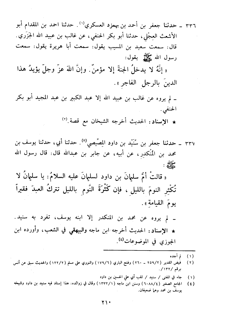 337 - حَدَّثَنَا جَعْفَرُ بْنُ سُنَيْدِ بْنِ دَاوُدَ الْمِصِّيصِيُّ، حَدَّثَنَا أَبِي، حَدَّثَنَا يُوسُفُ بْنُ مُحَمَّدِ بْنِ الْمُنْكَدِرِ، عَنْ أَبِيهِ، عَنْ جَابِرِ بْنِ عَبْدِ اللَّهِ قَالَ: قَالَ رَسُولُ اللَّهِ صَلَّى اللَّهُ عَلَيْهِ وَآلِهِ وَسَلَّمَ: " قَالَتْ أُمُّ سُلَيْمَانَ بْنِ دَاوُدَ لِسُلَيْمَانَ عَلَيْهِ السَّلَامُ: يَا سُلَيْمَانُ §لَا تُكْثِرِ النَّوْمَ بِاللَّيْلِ، فَإِنَّ كَثْرَةَ النَّوْمِ بِاللَّيْلِ تَتْرُكُ الْعَبْدَ فَقِيرًا يَوْمَ الْقِيَامَةِ " لَمْ يَرْوِهِ عَنْ مُحَمَّدِ بْنِ الْمُنْكَدِرِ إِلَّا ابْنُهُ يُوسُفُ تَفَرَّدَ بِهِ سُنَيْدٌ