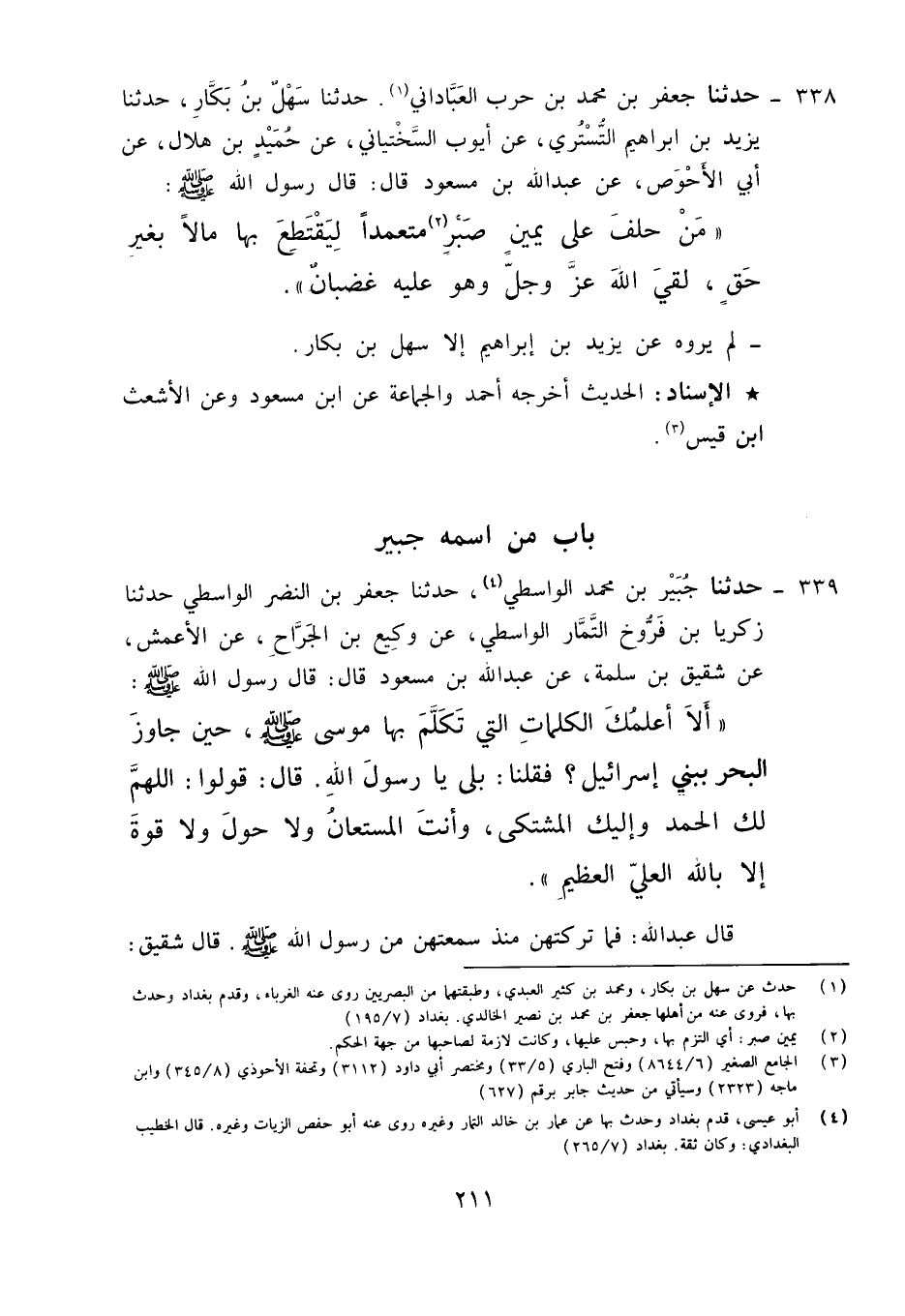 338 - حَدَّثَنَا جَعْفَرُ بْنُ مُحَمَّدِ بْنِ حَرْبٍ الْعَبَّادَانِيُّ، حَدَّثَنَا سَهْلُ بْنُ بَكَّارٍ، حَدَّثَنَا يَزِيدُ بْنُ إِبْرَاهِيمَ التُّسْتَرِيُّ، عَنْ أَيُّوبَ السِّخْتِيَانِيِّ، عَنْ حُمَيْدِ بْنِ هِلَالٍ، عَنْ أَبِي الْأَحْوَصِ، عَنْ عَبْدِ اللَّهِ بْنِ مَسْعُودٍ قَالَ: قَالَ رَسُولُ اللَّهِ صَلَّى اللَّهُ عَلَيْهِ وَآلِهِ وَسَلَّمَ: «§مَنْ حَلَفَ عَلَى يَمِينِ صَبْرٍ مُتَعَمِّدًا لِيَقْتَطِعَ بِهَا مَالًا بِغَيْرِ حَقٍّ لَقِيَ اللَّهَ عَزَّ وَجَلَّ وَهُوَ عَلَيْهِ غَضْبَانُ» لَمْ يَرْوِهِ عَنْ يَزِيدَ بْنِ إِبْرَاهِيمَ إِلَّا سَهْلُ بْنُ بَكَّارٍ