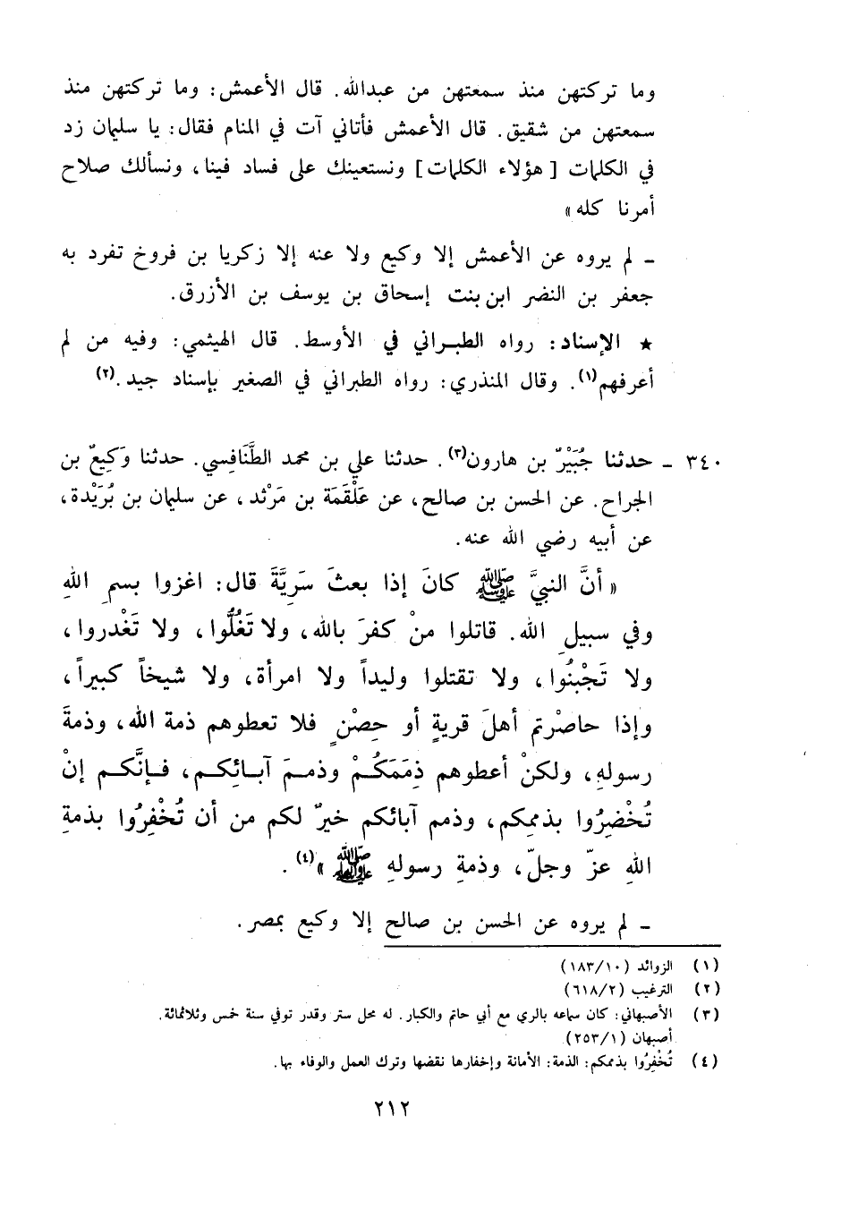 340 - حَدَّثَنَا جُبَيْرُ بْنُ هَارُونَ الْأَصْبَهَانِيُّ، حَدَّثَنَا عَلِيُّ بْنُ مُحَمَّدٍ الطَّنَافِسِيُّ، حَدَّثَنَا وَكِيعُ بْنُ الْجَرَّاحِ، عَنِ الْحَسَنِ بْنِ صَالِحٍ، عَنْ عَلْقَمَةَ بْنِ مَرْثَدٍ، عَنْ سُلَيْمَانَ بْنِ بُرَيْدَةَ، عَنْ أَبِيهِ رَضِيَ اللَّهُ عَنْهُ أَنَّ النَّبِيَّ صَلَّى اللَّهُ عَلَيْهِ وَآلِهِ وَسَلَّمَ كَانَ إِذَا بَعَثَ سَرِيَّةً قَالَ: «§اغْزُوا بِسْمِ اللَّهِ , وَفِي سَبِيلِ اللَّهِ قَاتِلُوا مَنْ كَفَرَ بِاللَّهِ , لَا تَغُلُّوا , وَلَا تَغْدِرُوا , وَلَا تَجْبُنُوا , وَلَا تَقْتُلُوا وَلِيدًا , وَلَا امْرَأَةً , وَلَا شَيْخًا كَبِيرًا , وَإِذَا حَاصَرْتُمْ أَهْلَ قَرْيَةٍ أَوْ حِصْنٍ فَلَا تَعْطُوهُمْ ذِمَّةَ اللَّهِ وَذِمَّةَ رَسُولِهِ , وَلَكِنْ أَعْطَوْهُمْ ذِمَمَكُمْ وَذِمَمَ آبَائِكُمْ؛ فَإِنَّكُمْ إِنْ تَخْفِرُوا بِذِمَمِكُمْ وَذِمَمِ آبَائِكُمْ خَيْرٌ لَكُمْ مِنْ أَنْ تَخْفِرُوا بِذِمَّةِ اللَّهِ عَزَّ وَجَلَّ وَذِمَّةِ رَسُولِهِ صَلَّى اللَّهُ عَلَيْهِ وَآلِهِ وَسَلَّمَ» لَمْ يَرْوِهِ عَنِ الْحَسَنِ بْنِ صَالِحٍ إِلَّا وَكِيعٌ بِمِصْرَ
