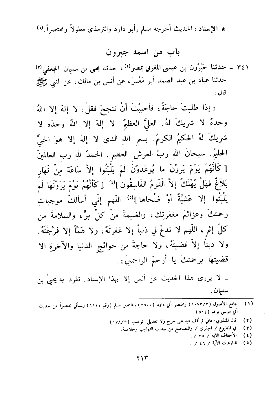 341 - حَدَّثَنَا جَبْرُونُ بْنُ عِيسَى الْمَغْرِبِيُّ، بِمِصْرَ , حَدَّثَنَا يَحْيَى بْنُ سُلَيْمَانَ الْجَفْرِيُّ، حَدَّثَنَا عَبَّادُ بْنُ عَبْدِ الصَّمَدِ أَبُو مَعْمَرٍ، عَنْ أَنَسِ بْنِ مَالِكٍ عَنِ النَّبِيِّ صَلَّى اللَّهُ عَلَيْهِ وَآلِهِ وَسَلَّمَ قَالَ: " §إِذَا طَلَبْتَ حَاجَةً فَأَحْبَبْتَ أَنْ تَنْجَحَ , فَقُلْ: لَا إِلَهَ إِلَّا اللَّهُ وَحْدَهُ لَا شَرِيكَ لَهُ الْعَلِيُّ الْعَظِيمُ , لَا إِلَهَ إِلَّا اللَّهُ وَحْدَهُ لَا شَرِيكَ لَهُ الْحَكِيمُ الْكَرِيمُ , بِسْمِ اللَّهِ الَّذِي لَا إِلَهَ إِلَّا هُوَ الْحَيُّ الْحَلِيمُ , سُبْحَانَ اللَّهِ رَبِّ الْعَرْشِ الْعَظِيمِ , الْحَمْدُ لِلَّهِ رَبِّ الْعَالَمِينَ , {كَأَنَّهُمْ يَوْمَ يَرَوْنَ مَا يُوعَدُونَ لَمْ يَلْبَثُوا} [الأحقاف: 35] إِلَّا سَاعَةً مِنْ نَهَارٍ بَلَاغٌ فَهَلْ يُهْلَكُ إِلَّا الْقَوْمُ الْفَاسِقُونَ , {كَأَنَّهُمْ يَوْمَ يَرَوْنَهَا لَمْ يَلْبَثُوا إِلَّا عَشِيَّةً أَوْ ضُحَاهَا} [النازعات: 46] اللَّهُمَّ , إِنِّي أَسْأَلُكَ مُوجِبَاتِ رَحْمَتِكَ , وَعَزَائِمَ مَغْفِرَتِكَ , وَالْغَنِيمَةَ مِنْ كُلِّ بِرٍّ , وَالسَّلَامَةَ مِنْ كُلِّ إِثْمٍ، اللَّهُمَّ لَا تَدَعْ لِي ذَنْبًا إِلَّا غَفَرْتَهُ , وَلَا هَمًّا إِلَّا فَرَّجْتَهُ , وَلَا دَيْنًا إِلَّا قَضَيْتَهُ , وَلَا حَاجَةً مِنْ حَوَائِجِ الدُّنْيَا وَالْآخِرَةِ إِلَّا قَضَيْتَهَا بِرَحْمَتِكَ , يَا أَرْحَمَ الرَّاحِمِينَ " لَا يُرْوَى هَذَا الْحَدِيثُ عَنْ أَنَسٍ إِلَّا بِهَذَا الْإِسْنَادِ تَفَرَّدَ بِهِ يَحْيَى بْنُ سُلَيْمَانَ