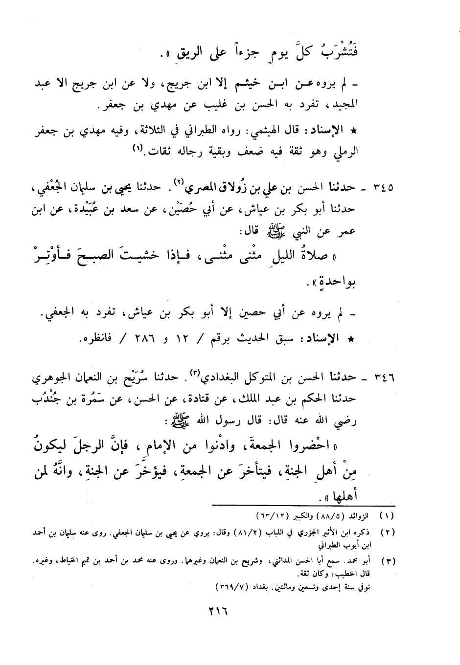 345 - حَدَّثَنَا الْحَسَنُ بْنُ عَلِيِّ بْنِ زُولَاقٍ الْمِصْرِيُّ، حَدَّثَنَا يَحْيَى بْنُ سُلَيْمَانَ الْجُعْفِيُّ، حَدَّثَنَا أَبُو بَكْرِ بْنُ عَيَّاشٍ، عَنْ أَبِي حُصَيْنٍ، عَنْ سَعْدِ بْنِ عُبَيْدَةَ، عَنِ ابْنِ عُمَرَ عَنِ النَّبِيِّ صَلَّى اللَّهُ عَلَيْهِ وَآلِهِ وَسَلَّمَ قَالَ: «§صَلَاةُ اللَّيْلِ مَثْنَى مَثْنَى , فَإِذَا خَشِيتَ الصُّبْحَ فَأَوْتِرْ بِوَاحِدَةٍ» لَمْ يَرْوِهِ عَنْ أَبِي حُصَيْنٍ إِلَّا أَبُو بَكْرِ بْنُ عَيَّاشٍ تَفَرَّدَ بِهِ الْجُعْفِيُّ