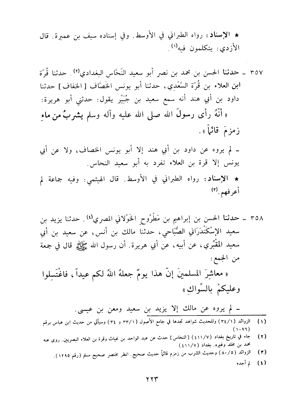 357 - حَدَّثَنَا الْحَسَنُ بْنُ مُحَمَّدِ بْنِ نَصْرِ أَبُو سَعِيدٍ النَّحَّاسُ الْبَغْدَادِيُّ، حَدَّثَنَا قُرَّةُ بْنُ الْعَلَاءِ بْنِ قُرَّةَ السَّعْدِيُّ، حَدَّثَنَا أَبُو يُونُسَ الْخَصَّافُ (الْخَفَّافُ) ، حَدَّثَنَا دَاوُدُ بْنُ أَبِي هِنْدَ، أَنَّهُ سَمِعَ سَعِيدَ بْنَ جُبَيْرٍ، يَقُولُ: حَدَّثَنِي أَبُو هُرَيْرَةَ أَنَّهُ " §رَأَى رَسُولَ اللَّهِ صَلَّى اللَّهُ عَلَيْهِ وَآلِهِ وَسَلَّمَ يَشْرَبُ مِنْ مَاءِ زَمْزَمَ قَائِمًا لَمْ يَرْوِهِ عَنْ دَاوُدَ بْنِ أَبِي هِنْدَ إِلَّا أَبُو يُونُسُ الْخَصَّافُ , وَلَا عَنْ أَبِي يُونُسَ إِلَّا قُرَّةُ بْنُ الْعَلَاءِ تَفَرَّدَ بِهِ أَبُو سَعِيدٍ النَّحَّاسُ