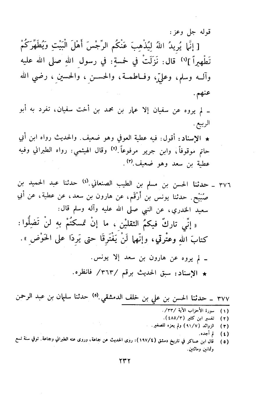 376 - حَدَّثَنَا الْحَسَنُ بْنُ مُسْلِمِ بْنِ الطَّيِّبِ الصَّنْعَانِيُّ، حَدَّثَنَا عَبْدُ الْحَمِيدِ بْنُ صُبَيْحٍ، حَدَّثَنَا يُونُسُ بْنُ أَرْقَمَ، عَنْ هَارُونَ بْنِ سَعْدٍ، عَنْ عَطِيَّةَ، عَنْ أَبِي سَعِيدٍ الْخُدْرِيِّ عَنِ النَّبِيِّ صَلَّى اللَّهُ عَلَيْهِ وَآلِهِ وَسَلَّمَ قَالَ: «§إِنِّي تَارِكٌ فِيكُمُ الثَّقَلَيْنِ مَا إِنْ تَمَسَّكْتُمْ بِهِ لَنْ تَضِلُّوا كِتَابَ اللَّهِ وَعِتْرَتِي , وَإِنَّهُمَا لَنْ يَفْتَرِقَا حَتَّى يَرِدَا عَلَى الْحَوْضِ» لَمْ يَرْوِهِ عَنْ هَارُونَ بْنِ سَعْدٍ إِلَّا يُونُسُ