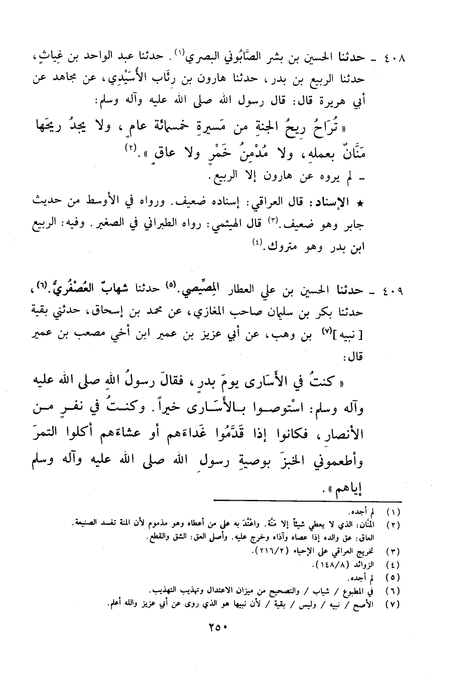 408 - حَدَّثَنَا الْحُسَيْنُ بْنُ بِشْرٍ الصَّابُونِي الْبَصْرِيُّ، حَدَّثَنَا عَبْدُ الْوَاحِدِ بْنُ غِيَاثٍ، حَدَّثَنَا الرَّبِيعُ بْنُ بَدْرٍ، حَدَّثَنَا هَارُونُ بْنُ رِئَابٍ الْأُسَيِّدِيُّ، عَنْ مُجَاهِدٍ، عَنْ أَبِي هُرَيْرَةَ قَالَ: قَالَ رَسُولُ اللَّهِ صَلَّى اللَّهُ عَلَيْهِ وَآلِهِ وَسَلَّمَ: «§تَرَاحُ رِيحُ الْجَنَّةِ مِنْ مَسِيرَةِ خَمْسِمِائَةِ عَامٍ , وَلَا يَجِدُ رِيحَهَا مَنَّانٌ بِعَمَلِهِ , وَلَا مُدْمِنُ خَمْرٍ , وَلَا عَاقٌّ» لَمْ يَرْوِهِ عَنْ هَارُونَ إِلَّا الرَّبِيعُ