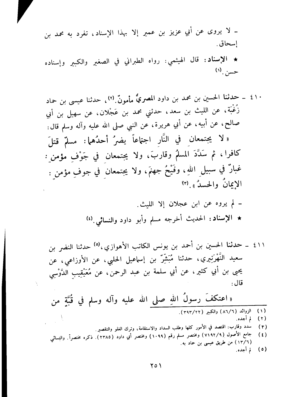410 - حَدَّثَنَا الْحُسَيْنُ بْنُ مُحَمَّدِ بْنِ دَاوُدَ الْمِصْرِيُّ مَأْمُونٌ , حَدَّثَنَا عِيسَى بْنُ حَمَّادٍ زُغْبَةُ , عَنِ اللَّيْثِ بْنِ سَعْدٍ، حَدَّثَنِي مُحَمَّدُ بْنُ عَجْلَانَ، عَنْ سُهَيْلِ بْنِ أَبِي صَالِحٍ، عَنْ أَبِيهِ، عَنْ أَبِي هُرَيْرَةَ عَنِ النَّبِيِّ صَلَّى اللَّهُ عَلَيْهِ وَآلِهِ وَسَلَّمَ قَالَ: «§لَا يَجْتَمِعَانِ فِي النَّارِ اجْتِمَاعًا يَضُرُّ أَحَدُهُمَا صَاحِبَهُ، مُسْلِمٌ قَتَلَ كَافِرًا ثُمَّ سَدَّدَ الْمُسْلِمُ وَقَارَبَ , وَلَا يَجْتَمِعَانِ فِي جَوْفِ مُؤْمِنٍ غُبَارٌ فِي سَبِيلِ اللَّهِ وَفَيْحُ جَهَنَّمَ , وَلَا يَجْتَمِعَانِ فِي جَوْفِ مُؤْمِنٍ الْإِيمَانُ وَالْحَسَدُ» لَمْ يَرْوِهِ عَنِ ابْنِ عَجْلَانَ إِلَّا اللَّيْثُ