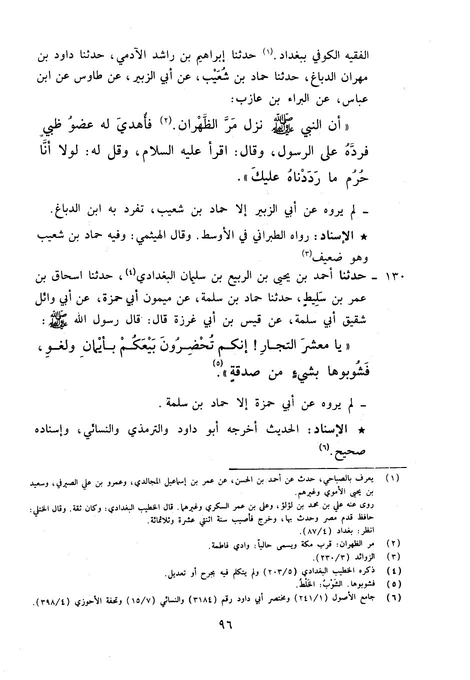 130 - حَدَّثَنَا أَحْمَدُ بْنُ يَحْيَى بْنِ الرَّبِيعِ بْنِ سُلَيْمَانَ الْبَغْدَادِيُّ، حَدَّثَنَا إِسْحَاقُ بْنُ عُمَرَ بْنِ سَلِيطٍ، حَدَّثَنَا حَمَّادُ بْنُ سَلَمَةَ، عَنْ مَيْمُونٍ أَبِي حَمْزَةَ، عَنْ أَبِي وَائِلٍ شَقِيقِ بْنِ سَلَمَةَ , عَنْ قَيْسِ بْنِ أَبِي غَرَزَةَ قَالَ: قَالَ رَسُولُ اللَّهِ صَلَّى اللَّهُ عَلَيْهِ وَآلِهِ وَسَلَّمَ: «§يَا مَعْشَرَ التُّجَّارِ , إِنَّكُمْ تَحْضُرُونَ بَيْعَكُمْ بِأَيْمَانٍ وَلَغْوٍ , فَشُوبُوهَا بِشَيْءٍ مِنْ صَدَقَةٍ» لَمْ يَرْوِهِ عَنْ أَبِي حَمْزَةَ إِلَّا حَمَّادُ بْنُ سَلَمَةَ